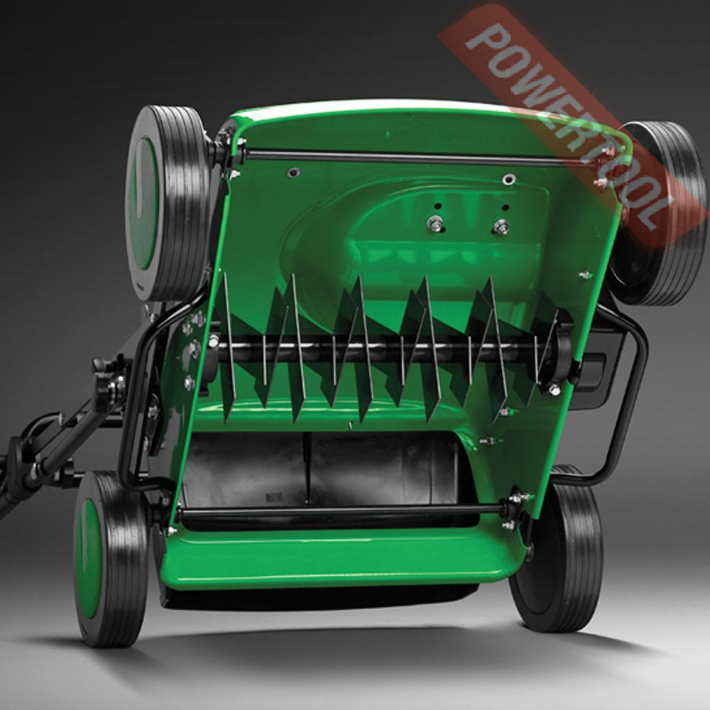 - Рабочий орган. Пятнадцать металлических ножей деликатно вычесывают траву, проникая в почву на 5 мм.