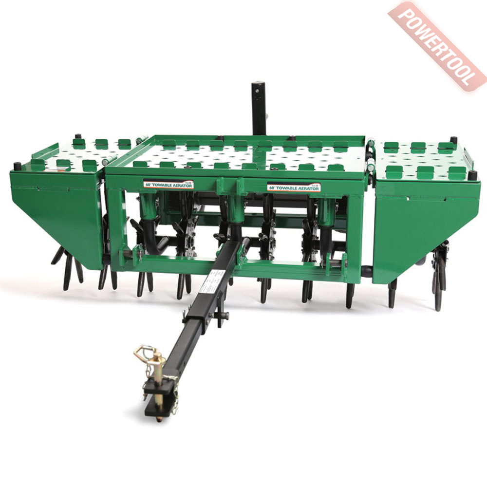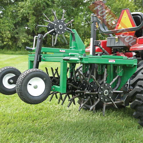Аэратор вертикуттер газона бензиновый прицепной, рабочая ширина 152 см, 122 см и 91 см со сложенными боковымы крыльями, глубина обработки до 100 мм, рабочий орган ножевой вал 80 зубьев, минимальная мощность трактора 20 л.с., категория сцепки 1 или 3-х точечная сцепка, стальной корпус, удобный доступ для обслуживания, пневматические колеса 33 см, возможность установки утяжилителей, габариты 2240х1520х890 мм, вес без утяжелитения 200 кг.