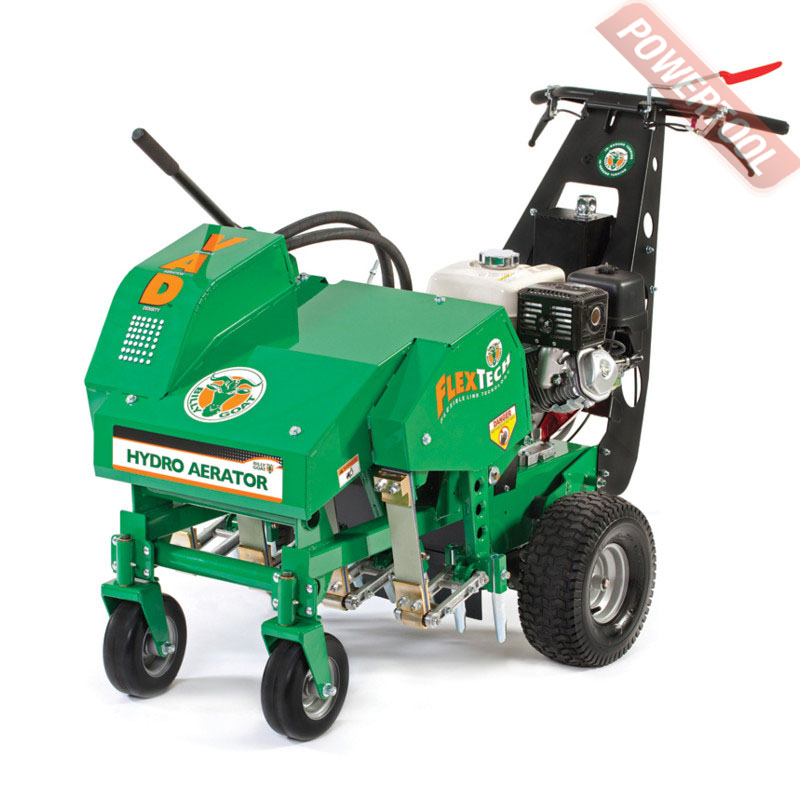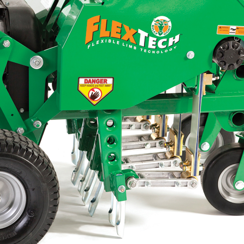 - Рабочий орган - пальчиковые пробивные паунсоны. В аэраторе используются съёмные тонкостенные зубья из закалённой износостойкой стали, а также применён новый механизм с приводом ножей от специального коленчатого вала. От 2-х до 10-ти раз больше отверстий аэрации за один рабочий проход.