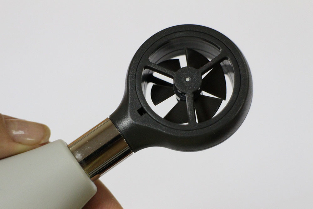 - Анемометр с крыльчаткой. Крыльчатка - подвижный элемент прибора позволяющий определять скорость движения потока частиц. Позволяет измерять скорость движения частиц следующим образом: поток проходя через профилированные лопатки вращает крыльчатку, частота вращения которой позволяет судить о скорости движения частиц газа. Переход от скорости вращения вала крыльчатки к показаниям скорости ветра может осуществляться с помощью зубчатой передачи(механический анемометр) или с помощью датчиков и вторичных преобразователей (электронный прибор).В зависимости от назначения крыльчатки могут изготавливаться различных размеров, размещаться на выносной штанге или непосредственно на приборе. Лопасти крыльчатки для измерения скорости воздуха изготавливают из пластмассы и, как правило, защищены ободом. В случае необходимости произведения измерений в агрессивных средах крыльчатка может изготавливаться из нержавеющей стали или химически стойких материалов. При установке анемометра в трубопровод, как правило, диаметр крыльчатки выбирают равным внутреннему диаметру трубы.