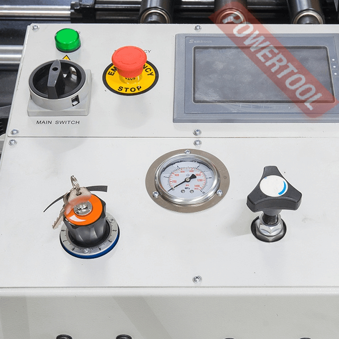 На основной панели расположены: цветной сенсорный дисплей, с помощью которого можно задать программу и отслеживать процесс пиления, регулятор скорости опускания пилы и кнопка аварийного останова.