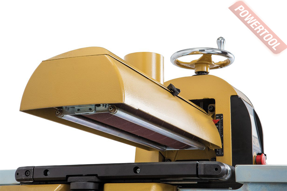 Для регулировки высоты положения шлифовального барабана предусмотрен массивный маховик с полированной поверхностью. Положение можно контролировать по привычной шкале на корпусе, но можно и по цифровому индикатору, так нагляднее и точнее. Он имеет переключатель режима отображения (дюймы/ миллиметры) и кнопку сброса для установки нулевого положения, что удобно как при смене толщины заготовок, так и при переходе к другой зернистости абразива. В качестве последнего используется лента шлифовальной бумаги, намотанная на алюминиевый барабан. Ее концы фиксируются в специальных зажимах, обеспечивающих простоту фиксации и автоматическое натяжение.