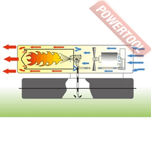 - Камера сгорания из нержавеющей стали. Форсунка распыляет дизель и он полностью сгорает в камере из нержавеющей стали. Во избежание эффекта копоти и дыма, рекомендуется своевременно обслуживать тепловую пушку, соблюдать правильные настройки подачи воздуха.