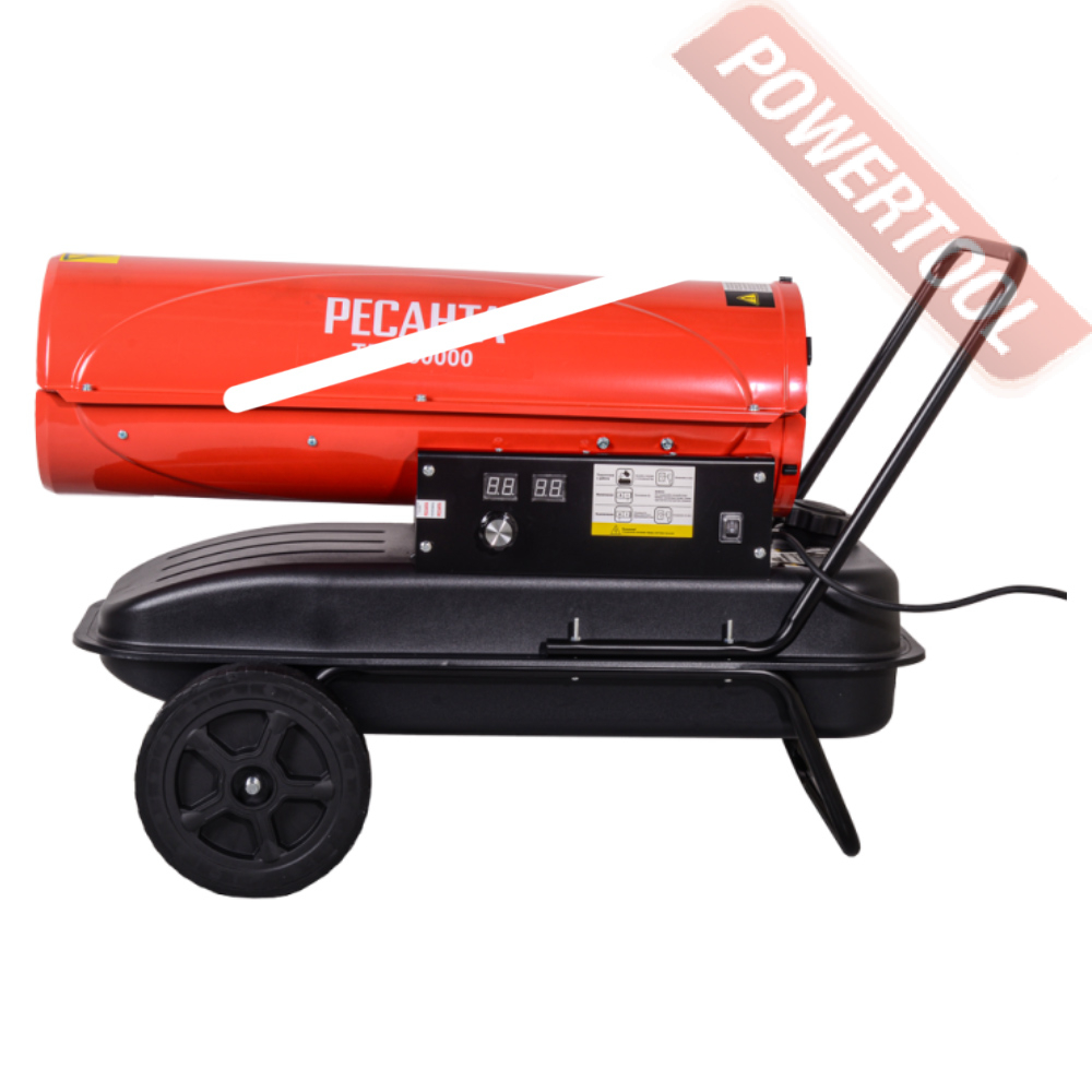 Дизельная тепловая пушка прямого нагрева РЕСАНТА ТДП-30000 может применяться на открытых или хорошо проветриваемых объектах, например, на строительных площадках, заводах, в складских помещениях. Предназначена для высокопроизводительного обогрева нежилых помещений, прогрева бетона или грунта при строительных и ремонтных работах. За короткое время может, обеспечить теплом большое пространство. Открытая камера сгорания выбрасывает вредные продукты вместе с горячим воздухом, поэтому применять в закрытых помещениях с людьми её нельзя. Перемещение и ввод в эксплуатацию не требует особых усилий и знаний. Запуск осуществляется нажатием одной кнопки, после продува системы происходит поджиг и дизельное топливо начинает равномерно сгорать в камере, а вентилятор создает воздушный поток и выдувает теплые массы в окружающее пространство. Уже на первой минуте работы жидкотопливного нагревателя, ощущается высокий КПД системы. Установка этой машины должна происходить в помещениях с возможностью проветривания, давая тем самым выход продуктам сгорания. Так как в технологии изготовления применен процесс прямого нагрева, то вместе с прогретым воздухом из сопла выходят элементы горения. Если нагнетательное давление сбалансировано и форсунка настроена правильно, то выхлопов минимальное количество, копать и темный дым отсутствуют.