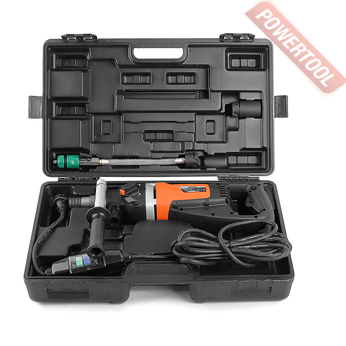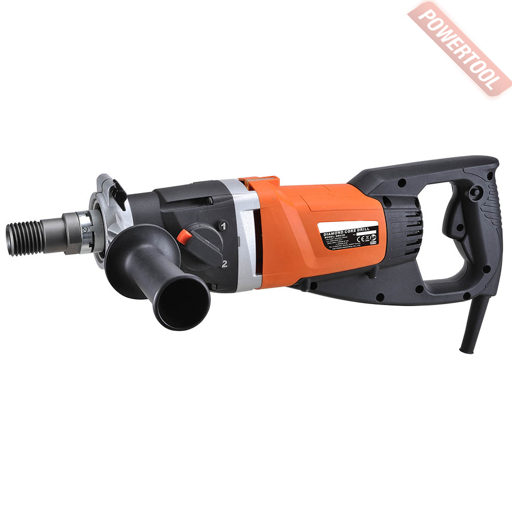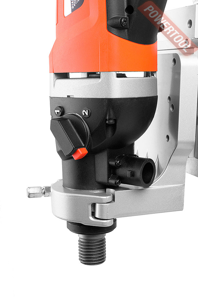 Дрель алмазного бурения, 1800 Вт, электрический двигатель 220 В, 2 скорости, 1800/3600 об/мин, max диаметр сверления 120 мм, резьба шпинделя 1 1/4 и 1/2 дюйма, плавный пуск и защита от перегрузок, PRCD, вес 5,2 кг.