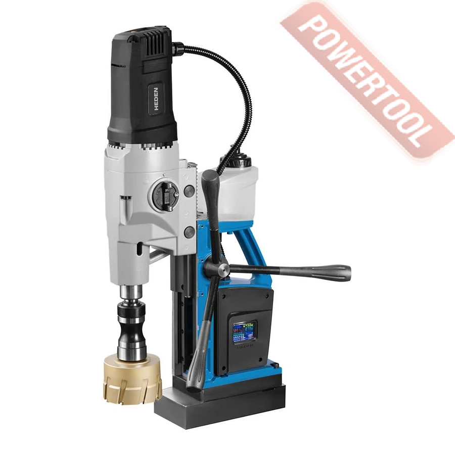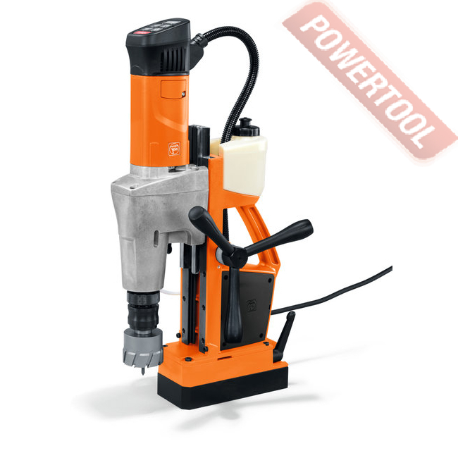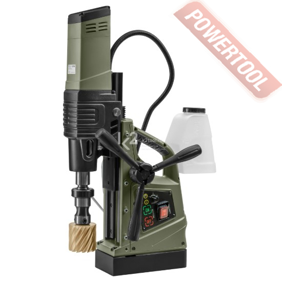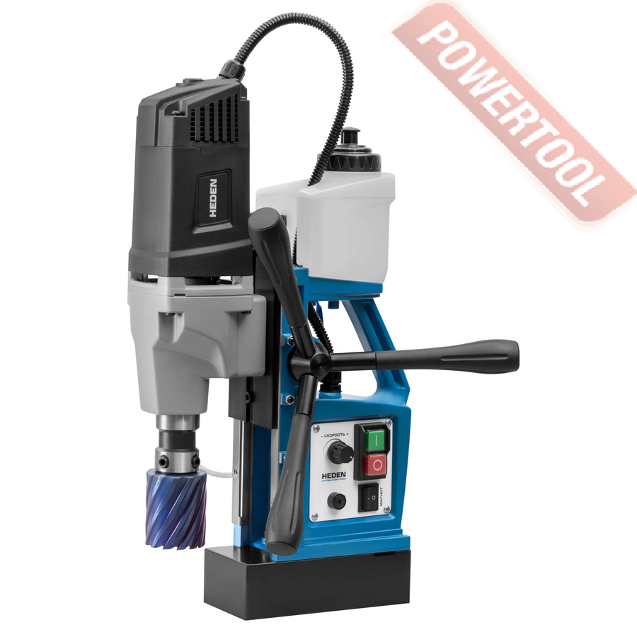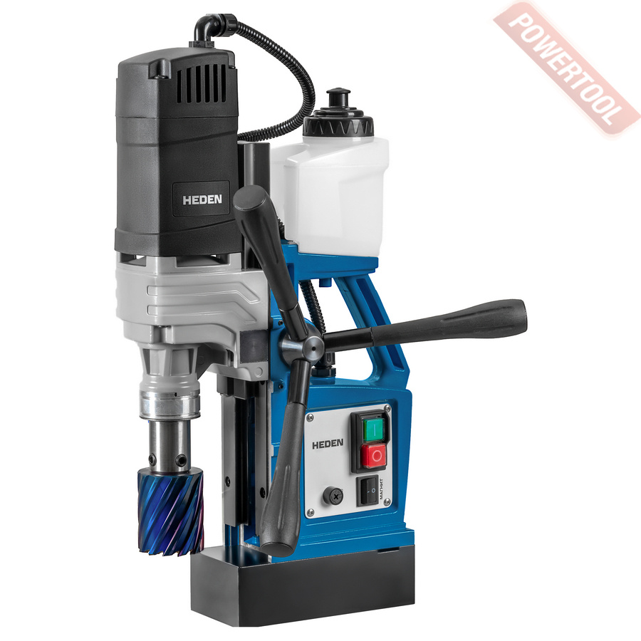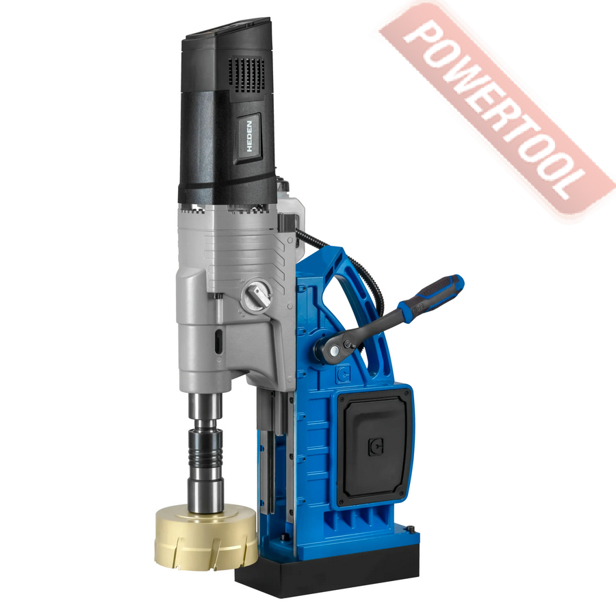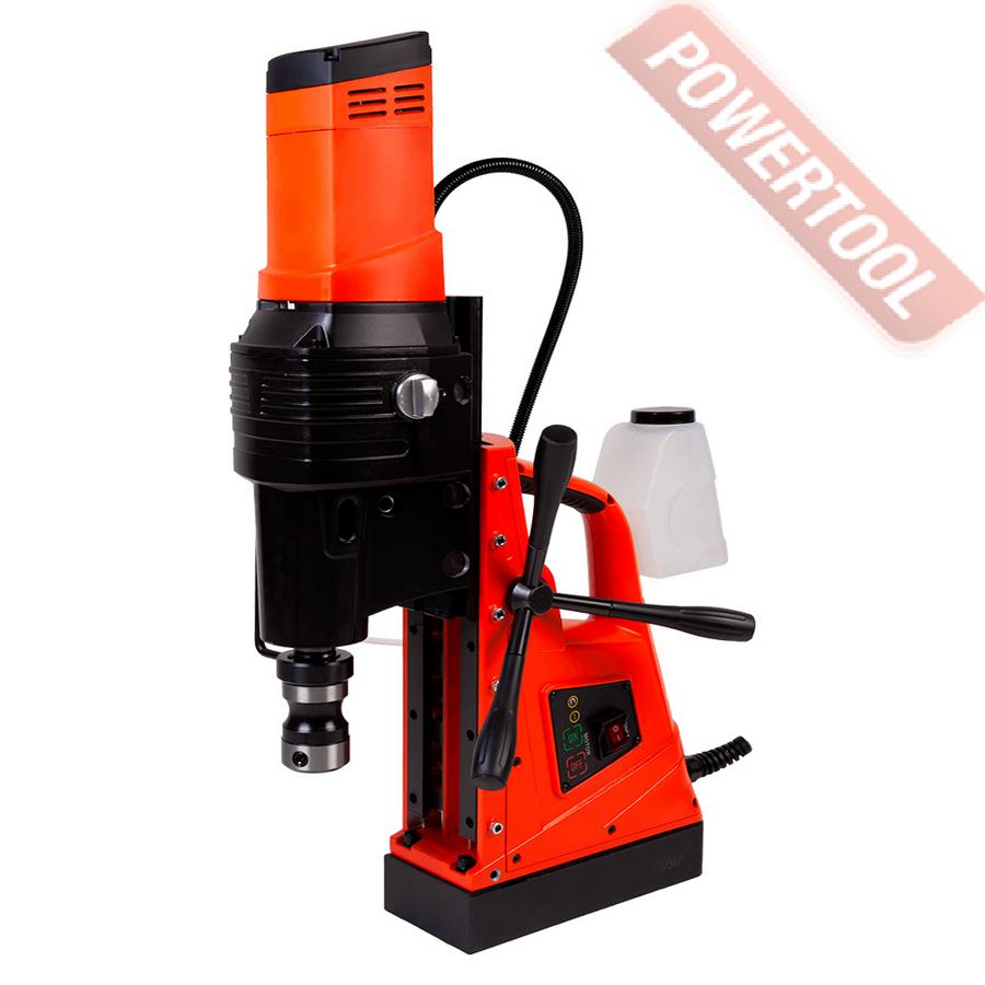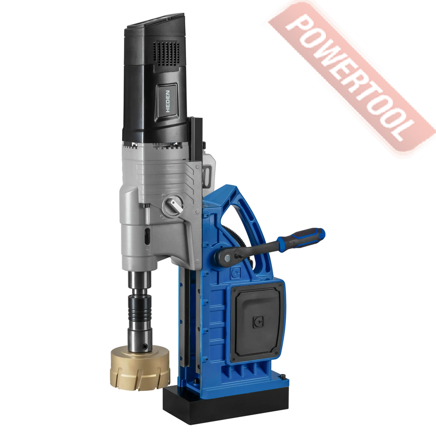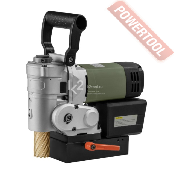 - Мощность 1200 Вт двигателя, передаваемая через трехступенчатый редуктор, позволяет сверлить с помощью коронок отверстия диаметром до 42 мм в стальных изделиях толщиной до 50 мм.