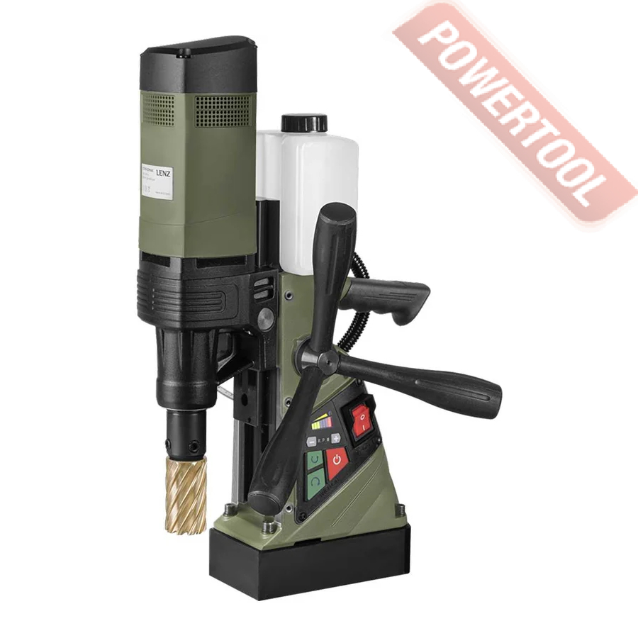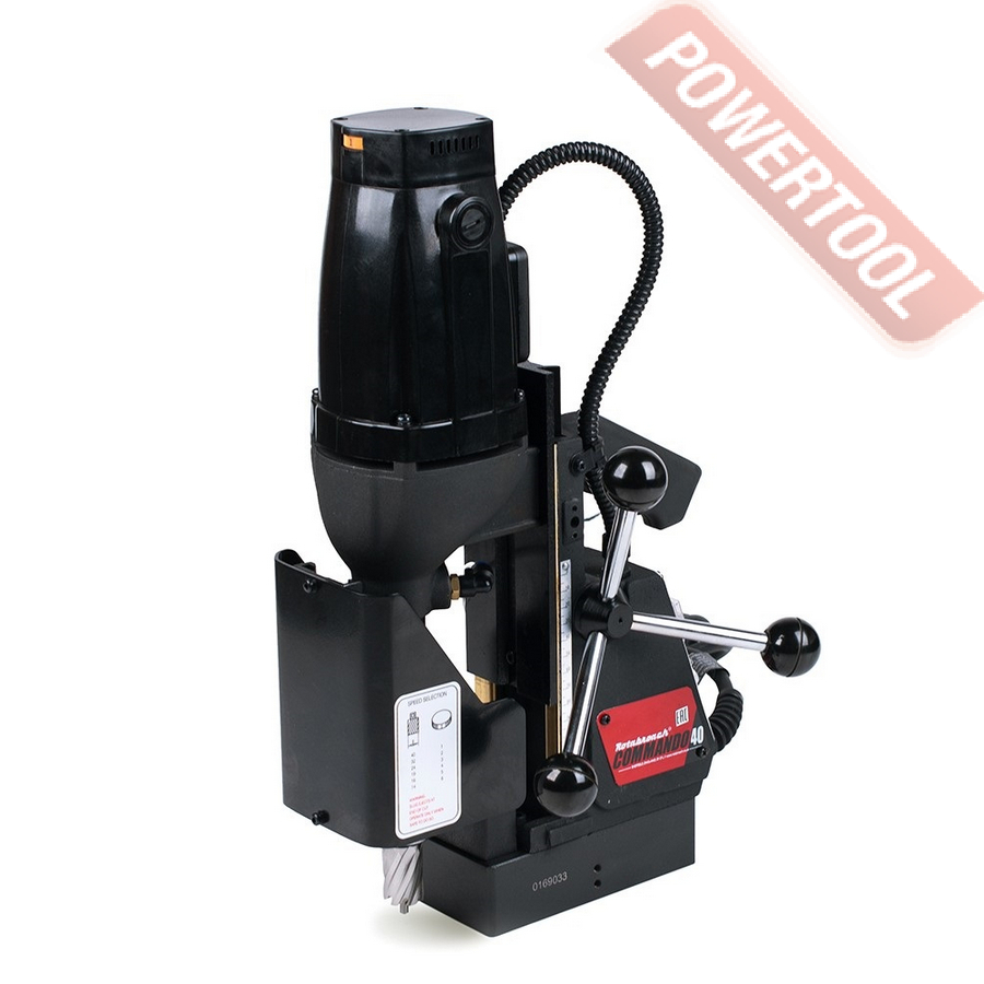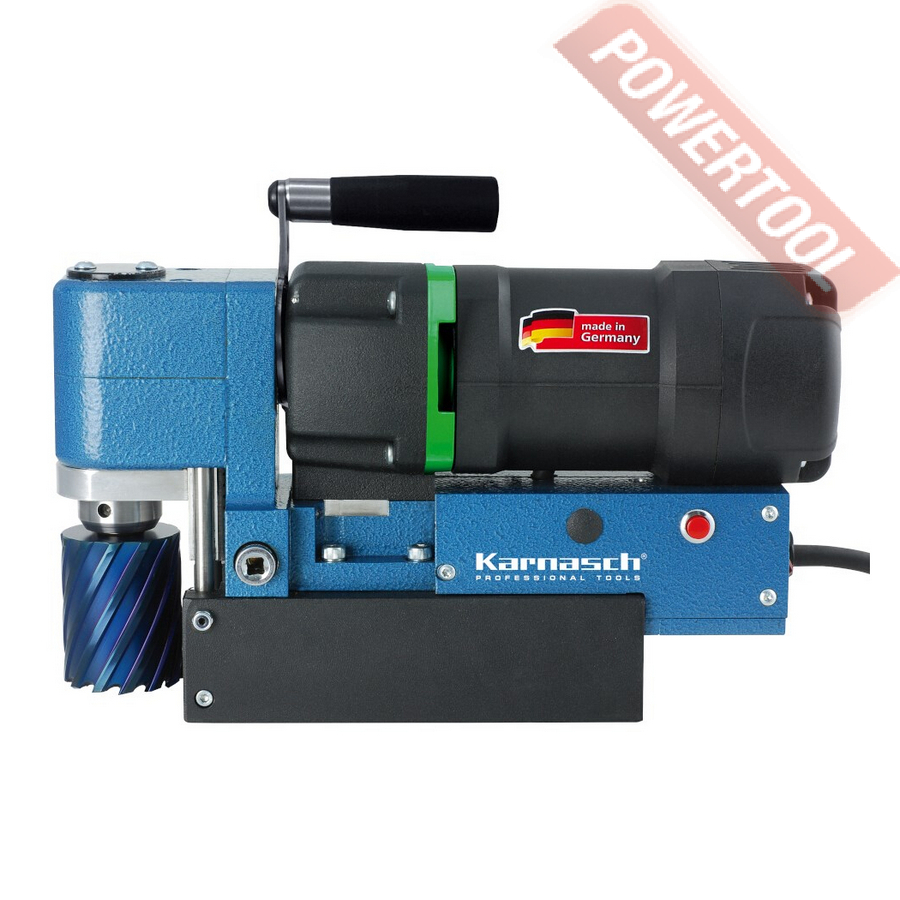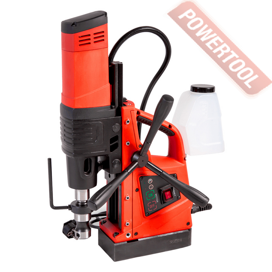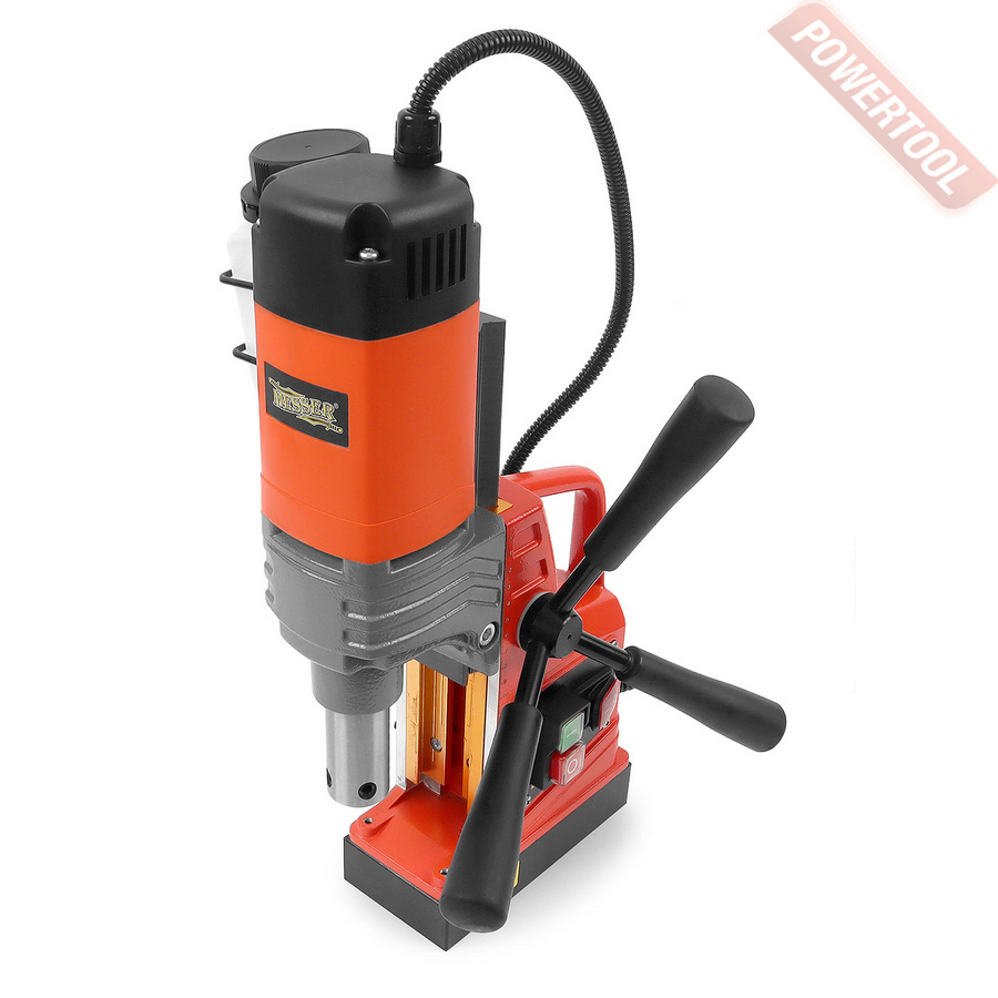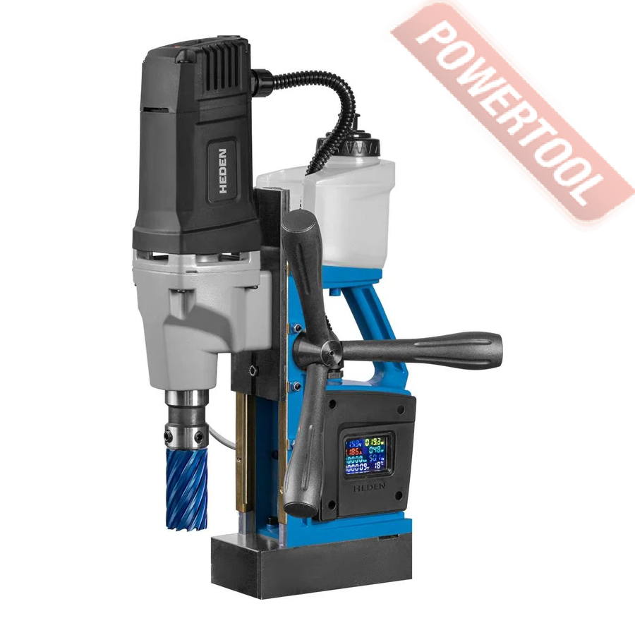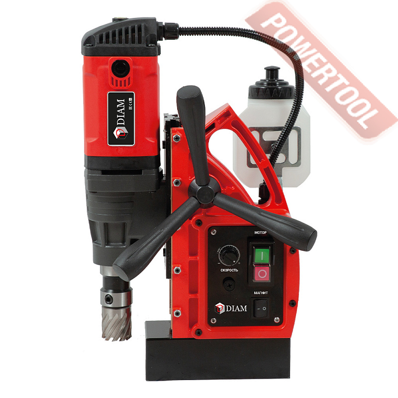 - Мощность 1200 Вт двигателя, передаваемая через трехступенчатый редуктор, позволяет сверлить с помощью коронок отверстия диаметром до 42 мм в стальных изделиях толщиной до 50 мм.