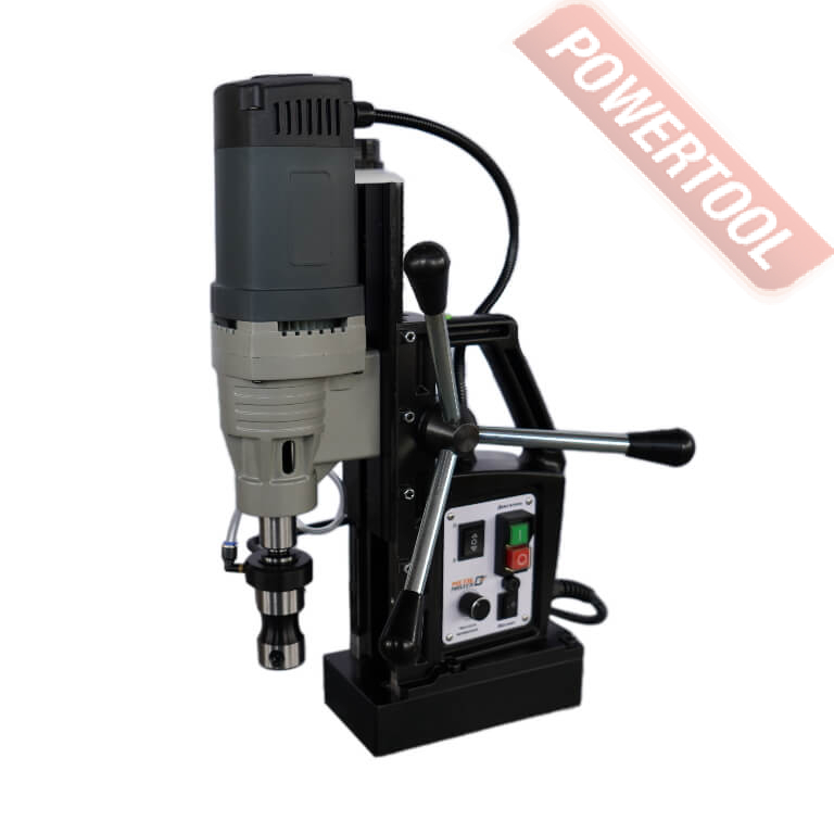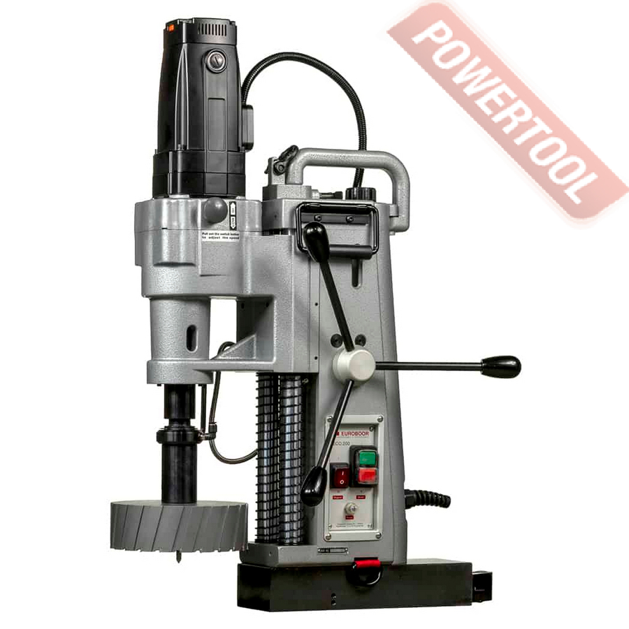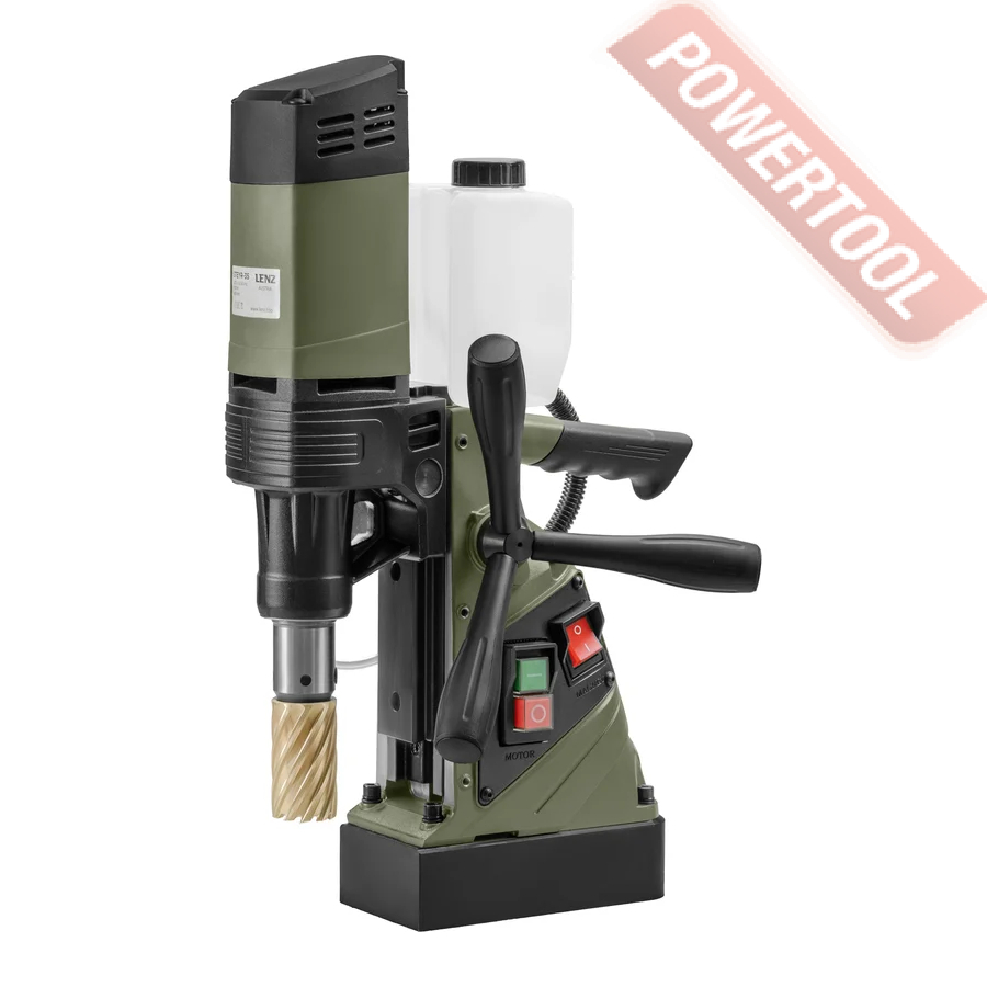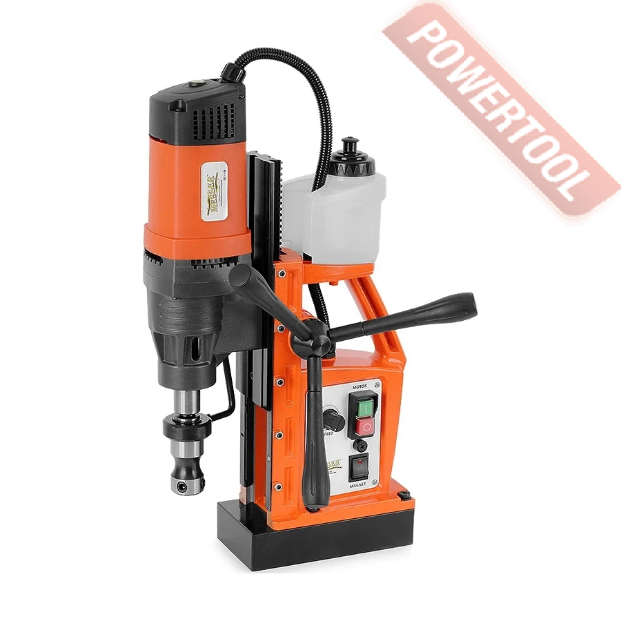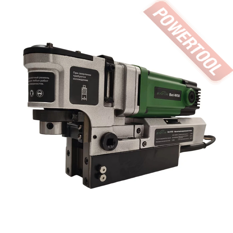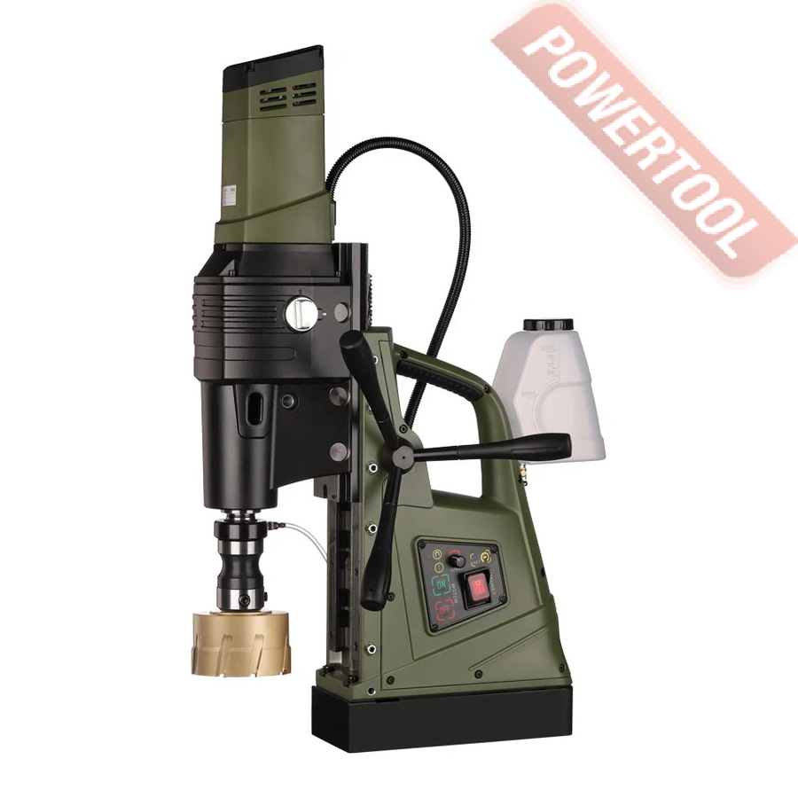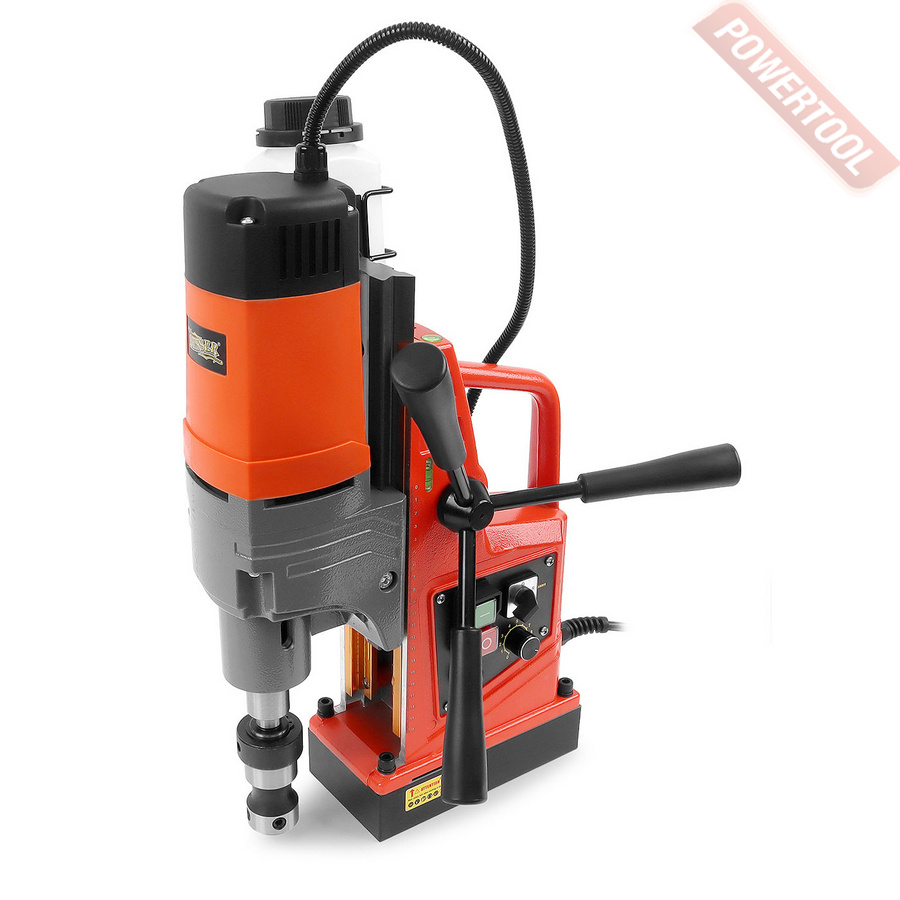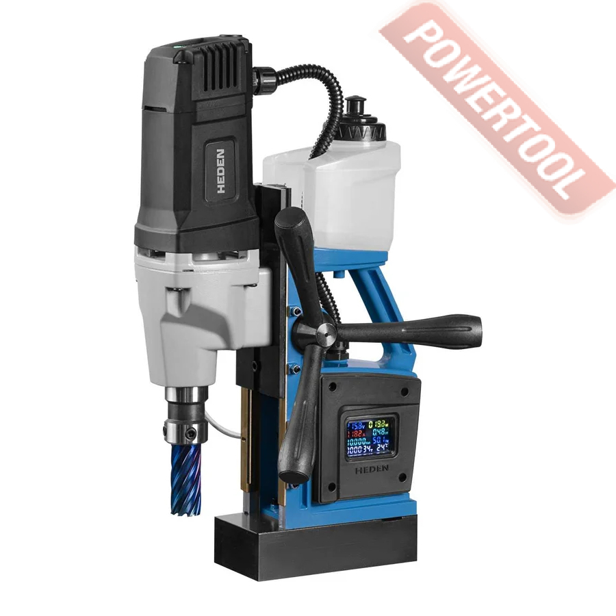 - Мощность 1200 Вт двигателя, передаваемая через трехступенчатый редуктор, позволяет сверлить с помощью коронок отверстия диаметром до 42 мм в стальных изделиях толщиной до 50 мм.