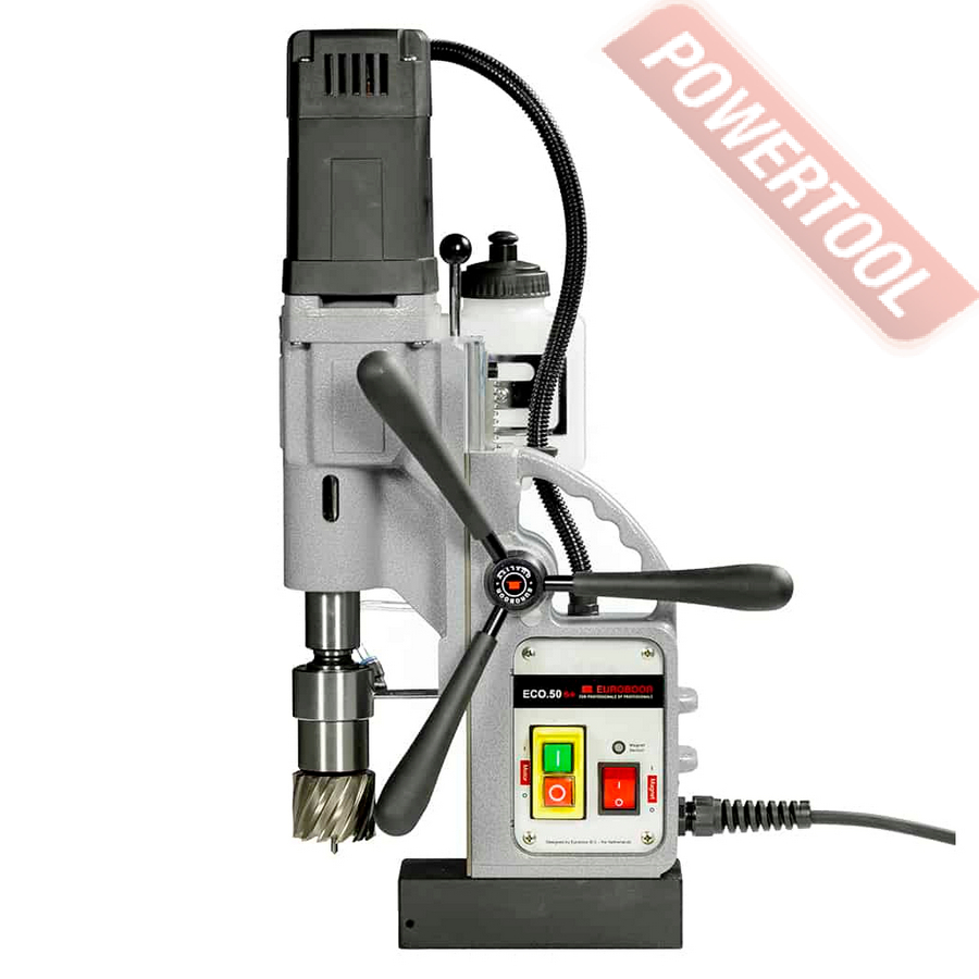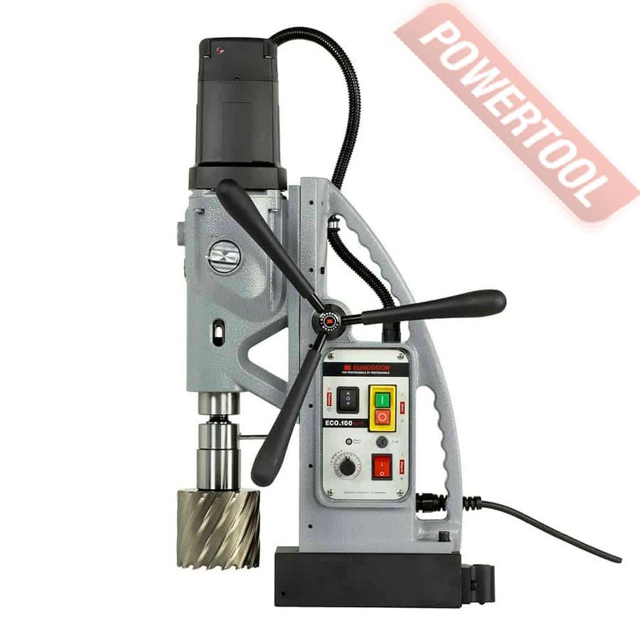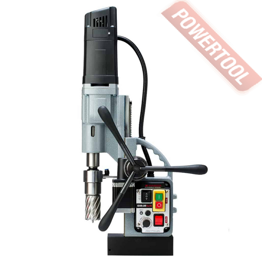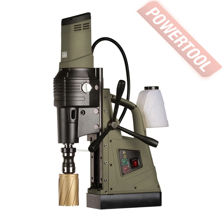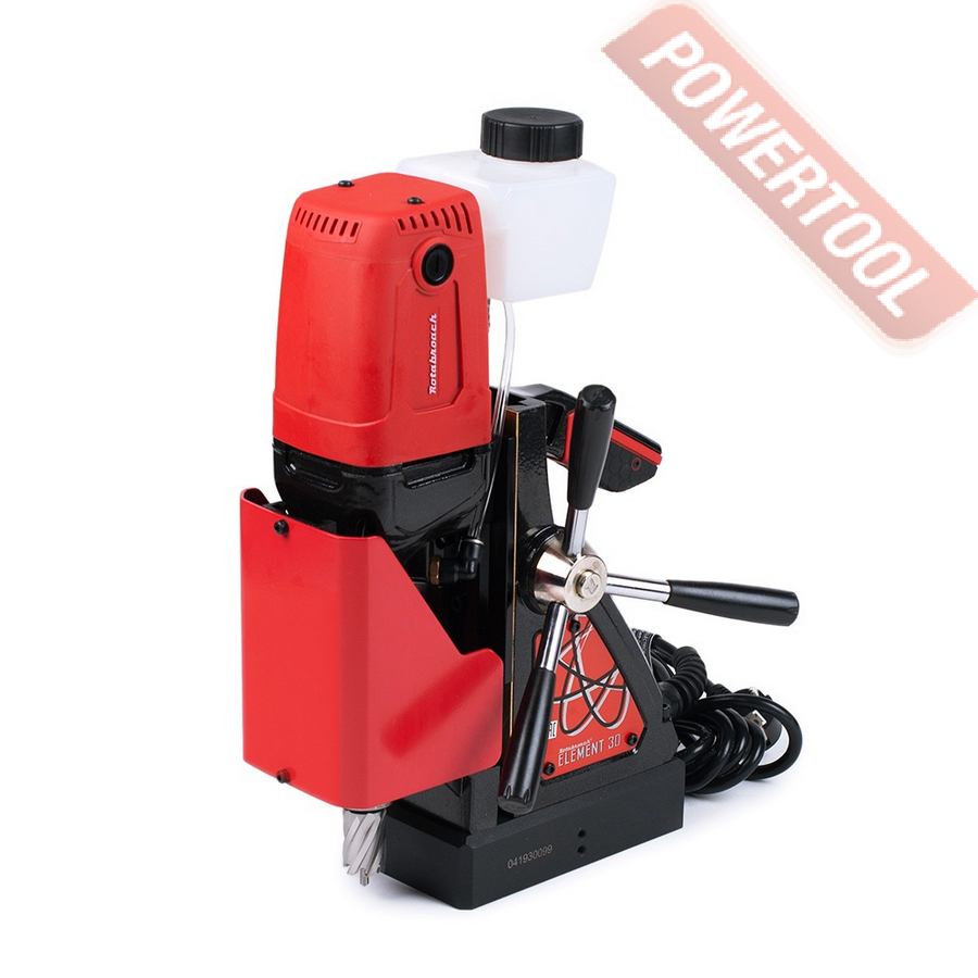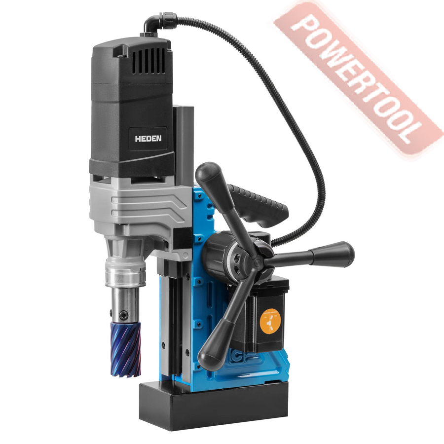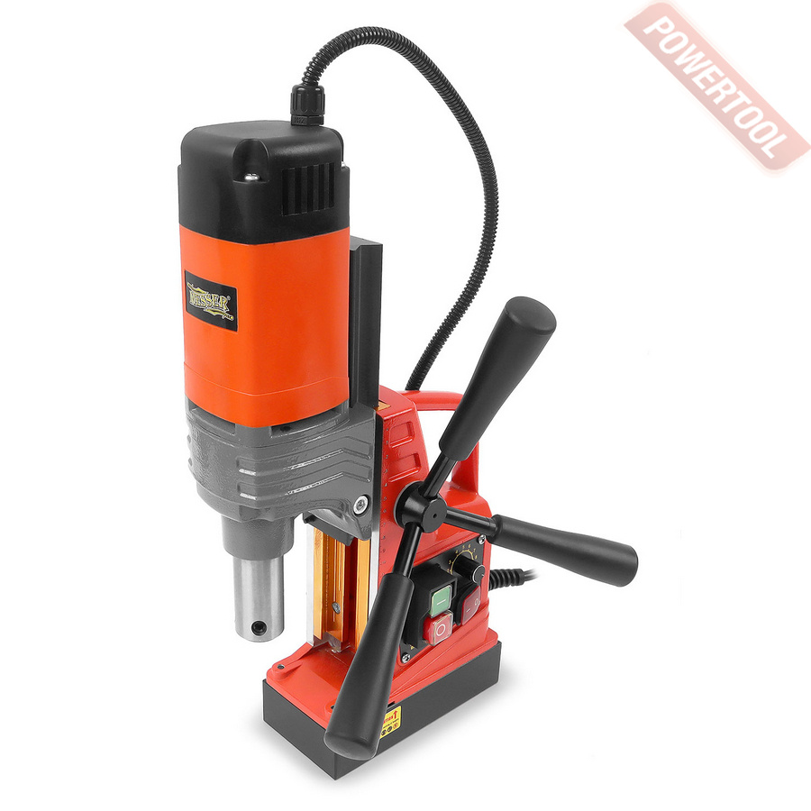 - Мощность 1200 Вт двигателя, передаваемая через трехступенчатый редуктор, позволяет сверлить с помощью коронок отверстия диаметром до 42 мм в стальных изделиях толщиной до 50 мм.