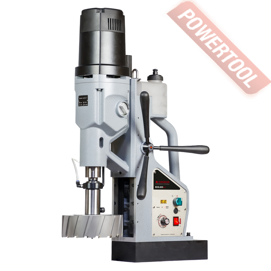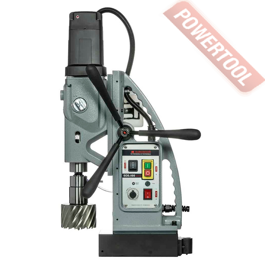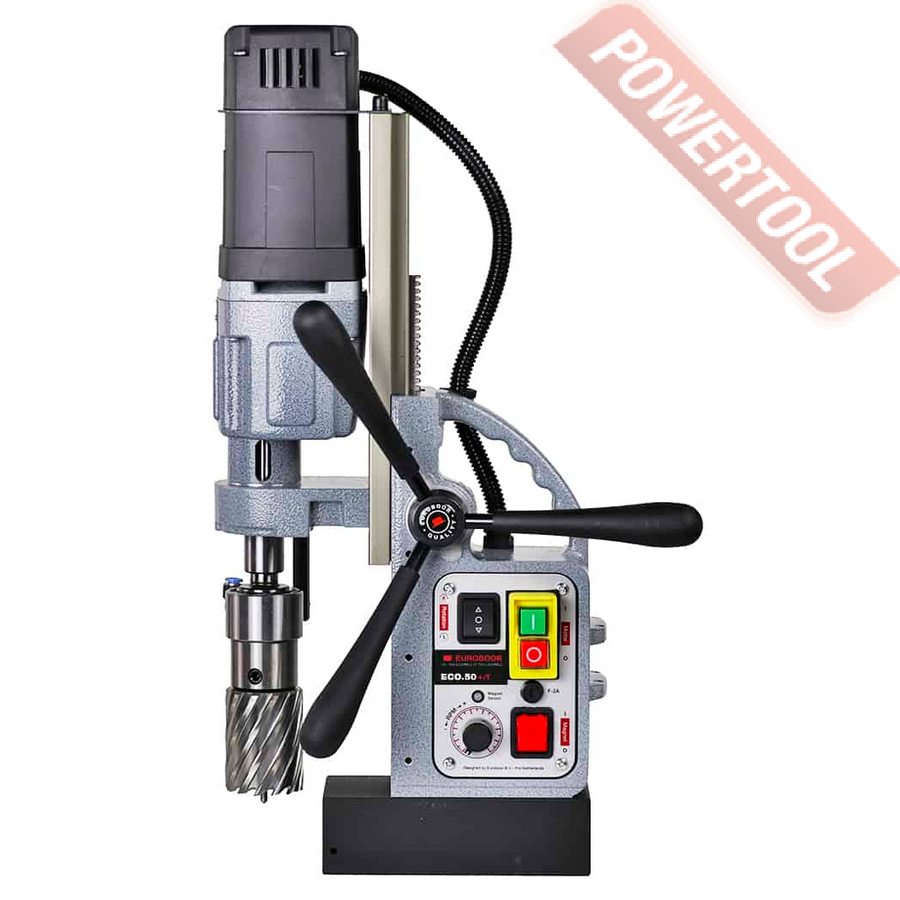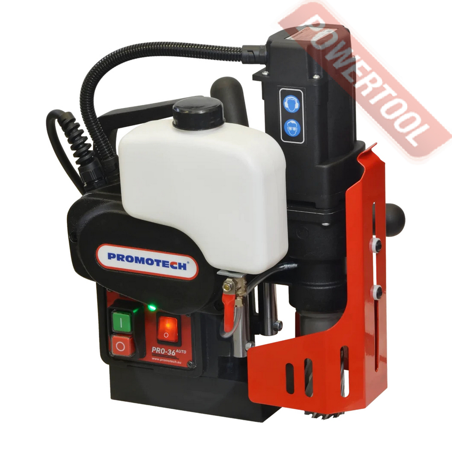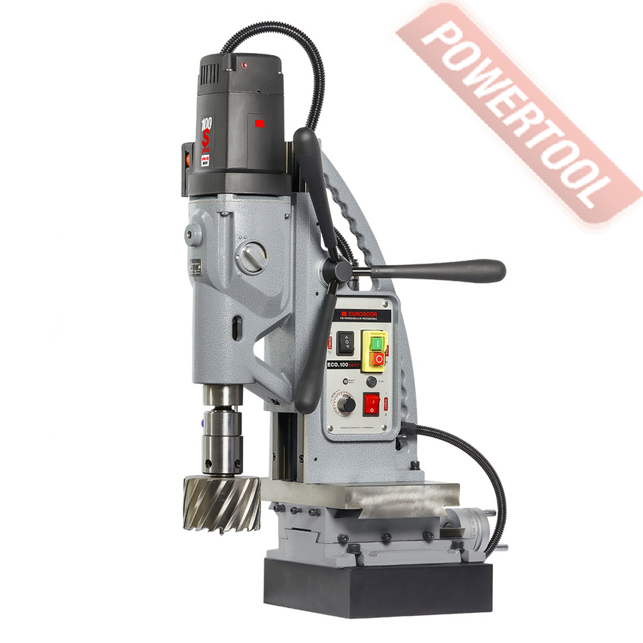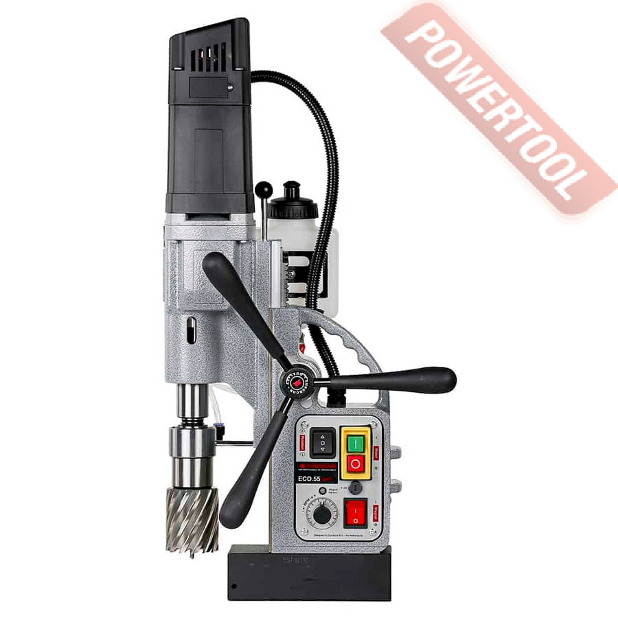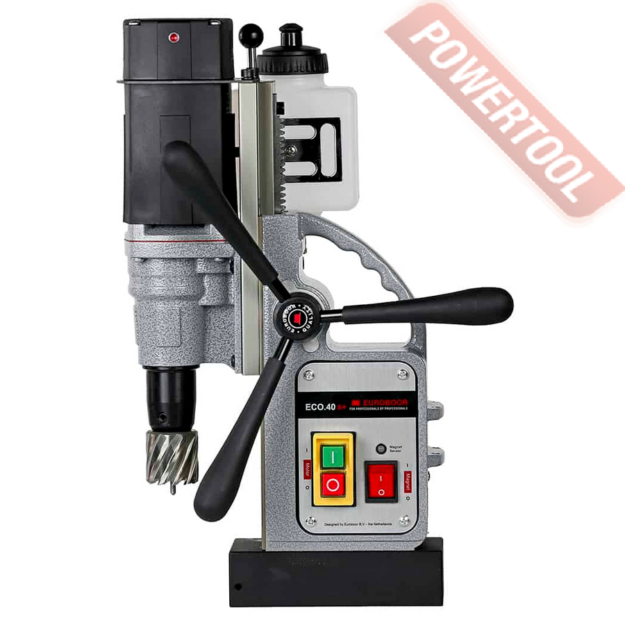 - Мощность 1200 Вт двигателя, передаваемая через трехступенчатый редуктор, позволяет сверлить с помощью коронок отверстия диаметром до 42 мм в стальных изделиях толщиной до 50 мм.