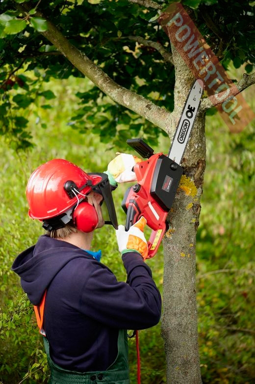 - Оснащена шиной и цепью производства Oregon. Натяжение цепи производится ключом спереди.