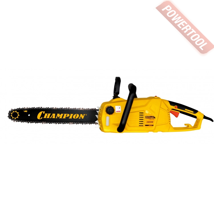 Электропила цепная, 230 В, 2400 Вт, продольное расположение двигателя, шина 40 см, шаг цепи 3/8 дюйма, ширина паза шины 1,3 мм, плавный пуск, скорость цепи 14 м/с, инерционный тормоз цепи, автоматическая смазка цепи, вес 6 кг.