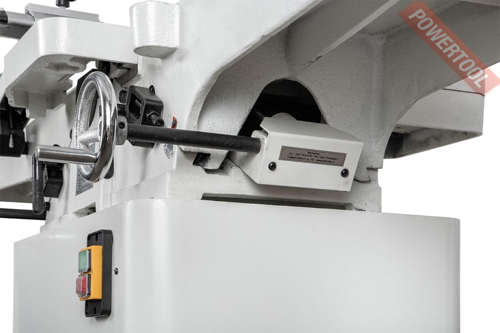 Фуговальный станок JET JJ-8L-M 220V с длинными чугунными столами и шириной строгания 200 мм. Конструкция образована двумя частями. В нижней, она играет роль тумбы-подставки, однофазный асинхронный мотор и кожух сбора стружки со 100-миллиметровым аспирационным патрубком. В верхней чугунные рабочие столы, защитный кожух, упор заготовки и чугунное основание, где размещен строгальный вал.