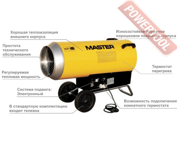 - Транспортировка. Газовая тепловая пушка Master BLP 103 E укомплектована тележкой, упрощающей транспортировку. Также для удобства перемещения устройства предусмотрены ручки, расположенные на корпусе.