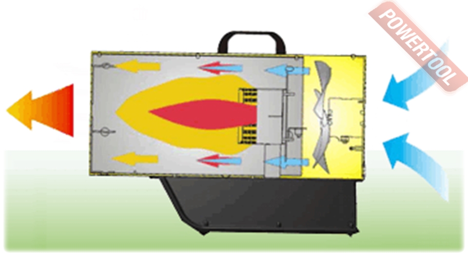 - Нагнетательный осевой вентилятор. Он создает воздушный поток, который выходит через рабочее сопло уже нагретый в теплообменнике прямого типа. Работает от сети 220 В потребляя немного энергии. Электродвигатель вентилятора имеет защиту от перегрева и скачков напряжения сети.