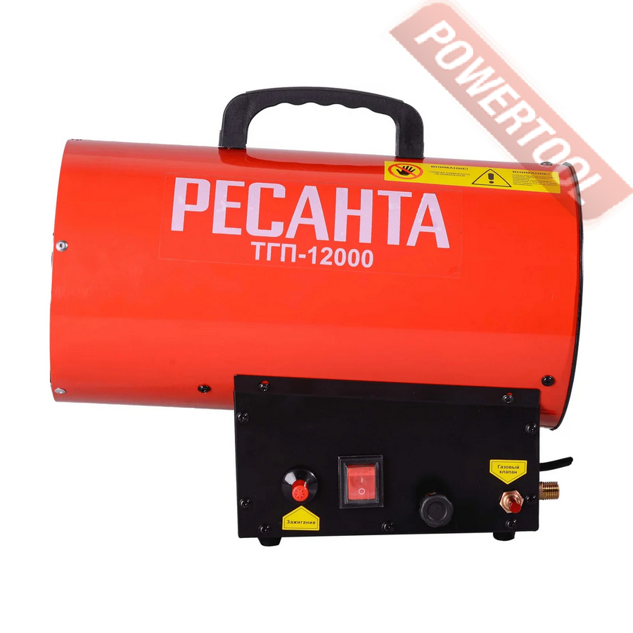 Газовая тепловая пушка РЕСАНТА ТГП-12000 - эффективный нагреватель воздуха, использующий в качестве топлива сжиженные газы: пропан, пропан-бутан, бутан. Применяется для обогрева складских помещений, цехов, ремонтных мастерских площадью до 120 кв.м, а также при монтаже натяжных потолков, для просушки окрашенных стен и штукатурки.