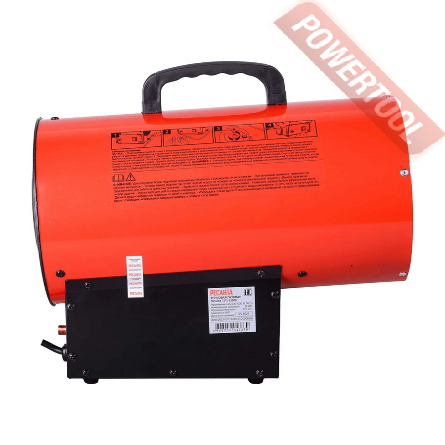 Тепловая газовая пушка, топливо: сжиженный газ (пропан/пропан-бутан/бутан), напряжение сети 220 В, тепловая мощность 7-12 кВт, расход воздуха 370 куб.м/ч, расход сжиженного газа 0,6-0,9 кг/ч, регулировка мощности, режим вентилятора, контроль пламени, датчик перегрева, пьезоэлектрический поджиг, вес 4,4 кг, газовый шланг, редуктор.