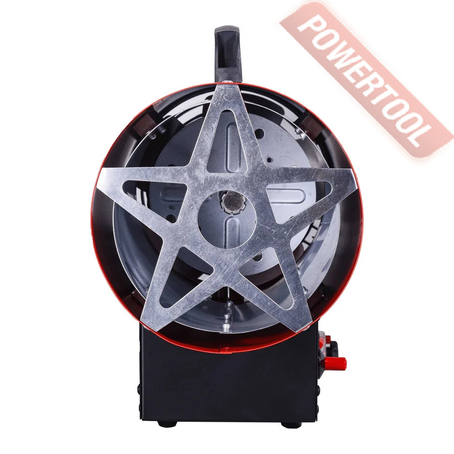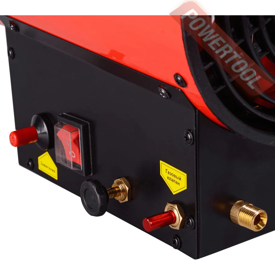 Сжиженный газ создает высокую температуру в камере сгорания тепловой пушки. Электрическая энергия однофазной сети необходима для работы вентилятора и функционирования автоматических узлов. Зажигание осуществляется с помощью пьезоэлектрического элемента. Теплопушка отличается экономичным расходом топлива 0,6-0,9 кг/час. Подача газа осуществляется под давлением 0,7 Бар. Контроль пламени происходит с помощью термодатчика из биметалла. Для обеспечения пожарной безопасности предусмотрена система защиты от перегрева. При отсоединении газового шланга тепловая пушка выполняет функцию вентилятора.