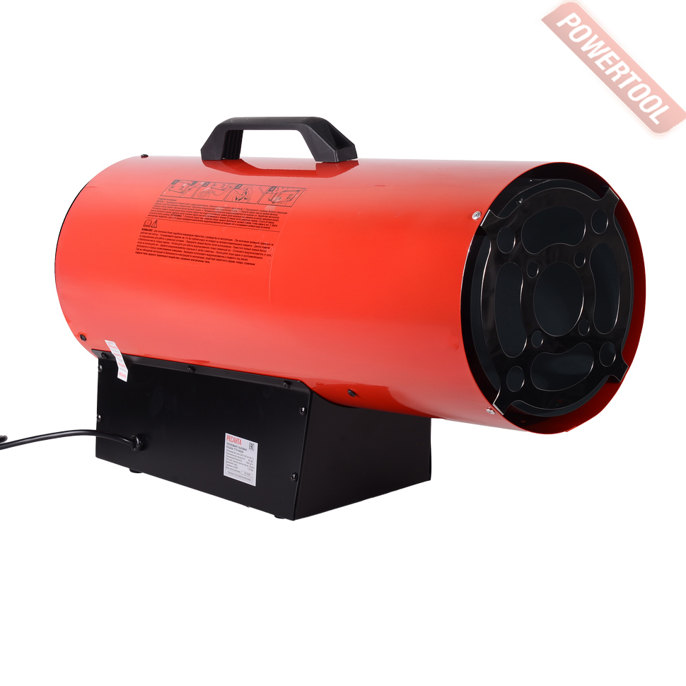 Газовая тепловая пушка РЕСАНТА ТГП-50000 - переносной обогреватель воздуха, работающий на газе, он быстро и эффективно обогревает большие площади. Это оборудование не требует больших затрат и капиталовложений. Газовые нагреватели воздуха широко применяются в помещениях с хорошей вентиляцией: на строительных площадках, заводах и в складских помещениях. Характерные особенности это полное использование топлива, а также обмен тепла благодаря непосредственному смешиванию входящего воздуха с продуктами сгорания. Что касается топлива, то для этих целей подходит баллон с пропаном или бутаном. Соответствующий шланг присоединяется через редуктор к вентилю баллона. Необходимо соблюдать все правила работы с газовыми баллонами. Также необходимо помнить, что процесс горения активно поглощает кислород, который жизненно необходим человеку. Поэтому помещения, где устанавливаются тепловые пушки, должны постоянно проветриваться и иметь хорошую вентиляцию. Для правильной работы обогреватель требует соответствующего количества свежего воздуха. Поэтому он предназначен для использования вне помещений или в помещениях с хорошей вентиляцией, где обеспечено соответствующее количество воздуха. Соответствующую вентиляцию можно обеспечить, приспосабливая обогревательную мощность прибора к площади помещения в соответствии со следующей пропорцией: 1 куб.м на каждые 100 Вт мощности. Ни в коем случае не рекомендуется, чтобы помещение было меньше, чем 100 куб.м. Соответствующий обмен воздуха может быть обеспечен благодаря вентиляционному отверстию, соответствующему следующим требованиям: величина 25 кв.см на 1 кВт обогревательной (минимум 250 кв.см) мощности, размещение точно между верхней и нижней частью помещения.