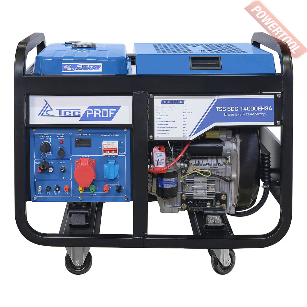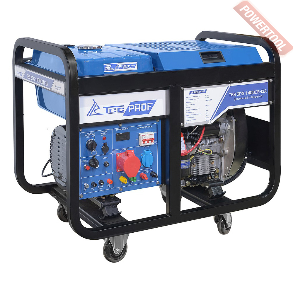 Генератор дизельный ТСС TSS SDG 14000EH3A предназначен для выработки электроэнергии с основными характеристиками: напряжение 220-380 вольт, частота 50 Гц и номинальной мощностью 12,0 кВт, оснащенный колесным комплектом для удобства передвижения. Трехфазный дизель генератор с максимальной мощностью 13 кВт не только отлично справится с созданием резервного электропитания в случаях отключения электроэнергии, но и гарантирует стабильную работу в качестве главного источника питания, при условии необходимости подключения трехфазных 380В потребителей. Может применяться в автосервисе, строительстве, аварийными службами, а так же на предприятиях малого бизнеса, для подключения бытовых приборов или строительного инструмента. К примеру, в автосервисе можно подключить трехфазный компрессор для работы автоподъемников, в моменты отключения электроэнергии. Необходимо учитывать, что схема соединения "Звезда" используемая в трехфазном дизель генераторе ТСС, позволяет, при подключении нагрузки к однофазному разъему 220В, получить полезную снимаемую мощность всего 4 кВт.