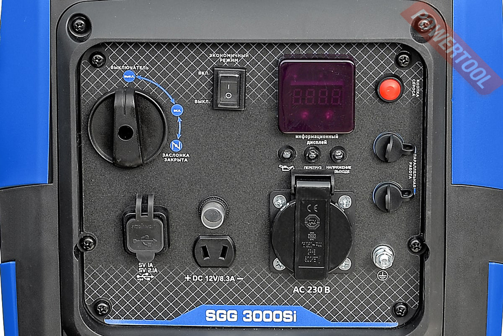 - Индикаторы на панели показывают параметры напряжения, превышение мощности генератора, низкий уровень масла.
