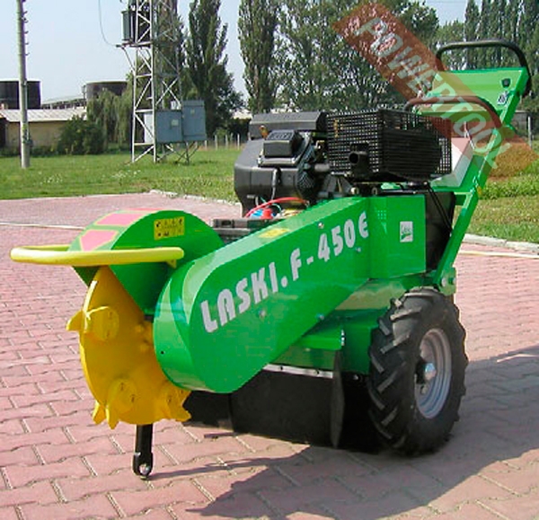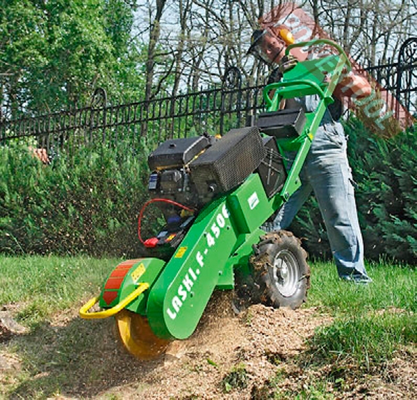 Измельчитель пней несамоходный LASKI F 460/18 применяется для уничтожения пней деревьев с возможностью проникновения фрезы на глубину 20 см ниже уровня земли. Минимальный диаметр пня не ограничен, но рекомендуется обрабатывать пни диаметром до 80 см - это связано с размерами оборудования. Рабочим органом является дисковая фреза с твердосплавными сменными ножами. Фреза крепится на раме, которая имеет возможность движения вверх-вниз и влево-вправо. Автоматический арретир подвижной верхней конструкции и простое управление максимально облегчают обращение с машиной. Принцип работы прост: оператор подъезжает к пню, блокирует колеса, включает фрезу, выбирает требуемую высоту и движениями влево-вправо с дальнейшим заглублением уничтожает пень.