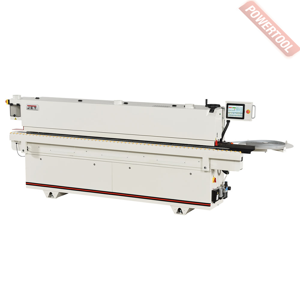 Кромкооблицовочный станок JET JEB-45CR - хорошо оснащенный кромкооблицовочный станок с простым и удобным управлением через сенсорный графический экран с русифицированным меню. Общее устройство аналогично другим моделям Jet: подающий конвейер цепного типа, клеевая ванна с тефлоновым покрытием и пятью нагревательными элементами, узлы автоматической торцовки свесов кромки и продольного фрезерования со следящим механизмом, но есть и существенные отличия. Прежде всего, это наличие узла прифуговки, производящего подготовку поверхности заготовки к склеиванию. Кроме устранения дефектов, возникших при распиловке, он «подгоняет» размер панели под толщину кромки так, чтобы он не увеличился на толщину облицовочного материала, а остался прежним, что очень удобно при работе с разными отделочными материалами. Кроме того, станок имеет более совершенный механизм обработки наклеенной кромки: после продольного фрезерования свесов производится дополнительная операция – фрезерования фаски (механизм аналогичен фрезерующему продольные свесы) - и лишь затем циклевка и полировка, это позволяет улучшить качество производимой продукции.Управление настройкой механизировано: многие операции, выполняемые на более простых станках вручную, здесь производятся электрическими приводами. Так, для переналадки на панели другой толщины достаточно ввести команды с панели сенсорного экрана. Основные узлы, требующие периодической смазки, подключены к централизованной системе с ручным насосом. Такое решение способствует существенному продлению ресурса, поскольку ежедневной смазкой вручную часто пренебрегают. По своим эксплуатационным характеристикам JEB-45CR является полноценным станком для работы в условиях поточного производства, долговечным, производительным и гибким в переналадке.