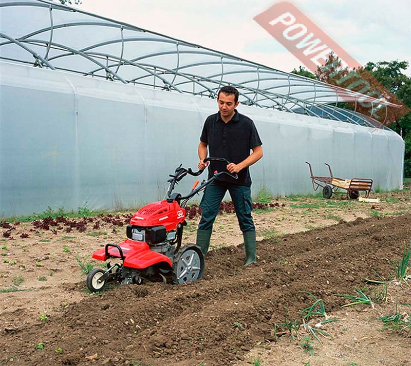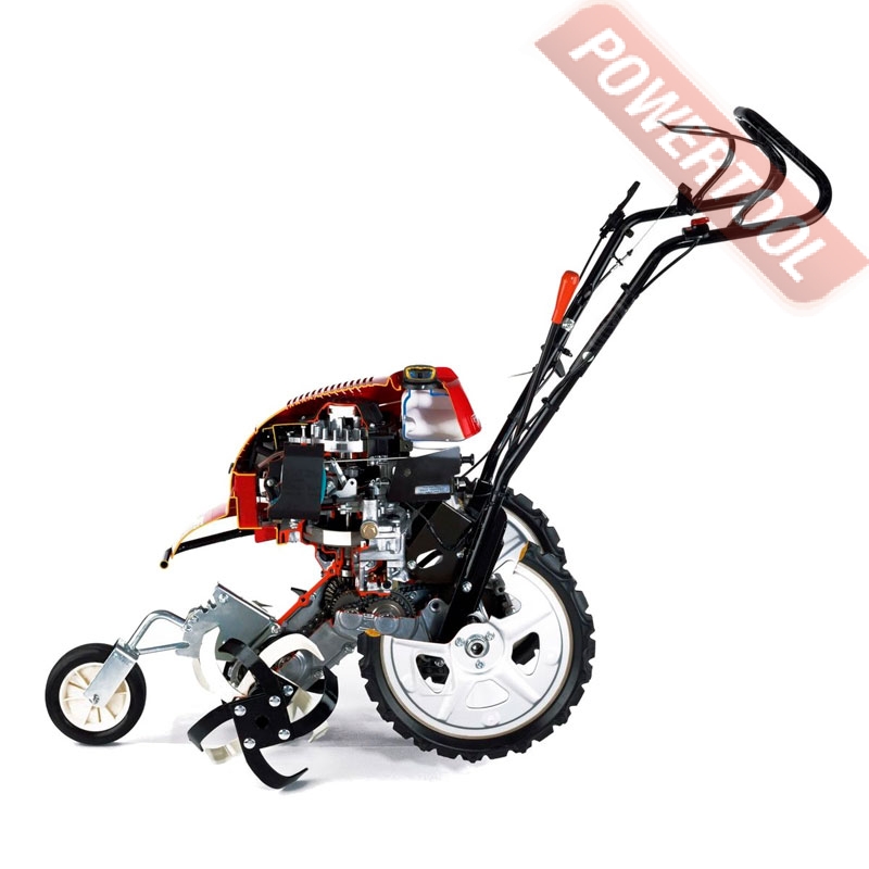 - Низкий центр тяжести и вертикальное расположение двигателя для компенсации перемещений культиватора вверх-вниз в процессе обработки почвы.