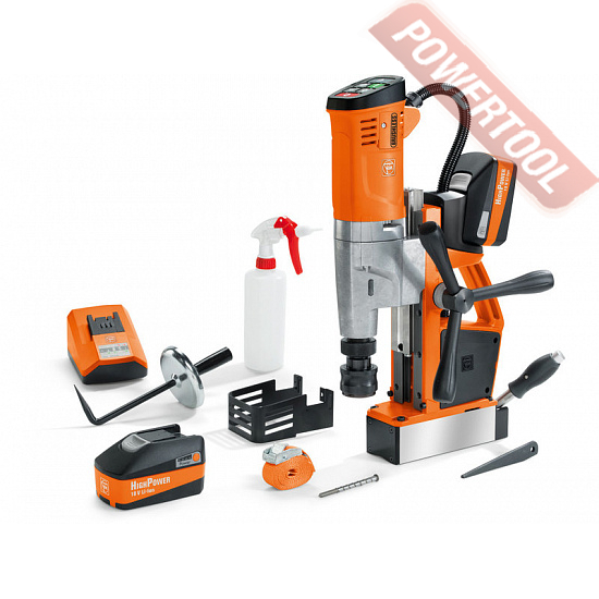 Магнитный сверлильный станок аккумуляторный, 18 В, max диаметр корончатого сверла 35 мм, max диаметр спирального сверла 18 мм, конус шпинделя КМ 2, крепление корончатого сверла на Fein QuickIN Plus 18, ход шпинделя 260 мм, max нарезаемая резьба M14, частота вращения шпинделя 130-520 об/мин, 1 скорость, прижимная сила 9000 Н, размер магнитного основания ДхШ 195х70 мм, габариты ДхШхВ 317х188х621 мм, вес 12,8 кг, реверс, плавная регулировка оборотов, индикация числа оборотов, система подачи СОЖ, замена сверла без инструмента, в комплекте патрон КМ 2/Fein QuickIN Plus 18, 2 аккумулятора литийионные, HighPower, устройство для ускоренной зарядки ALG 50, насос для охлаждающей жидкости, ремень для крепления, крючок для стружки, центрирующий штифт 100 мм, устройство защиты от прикосновения, клин, кейс.