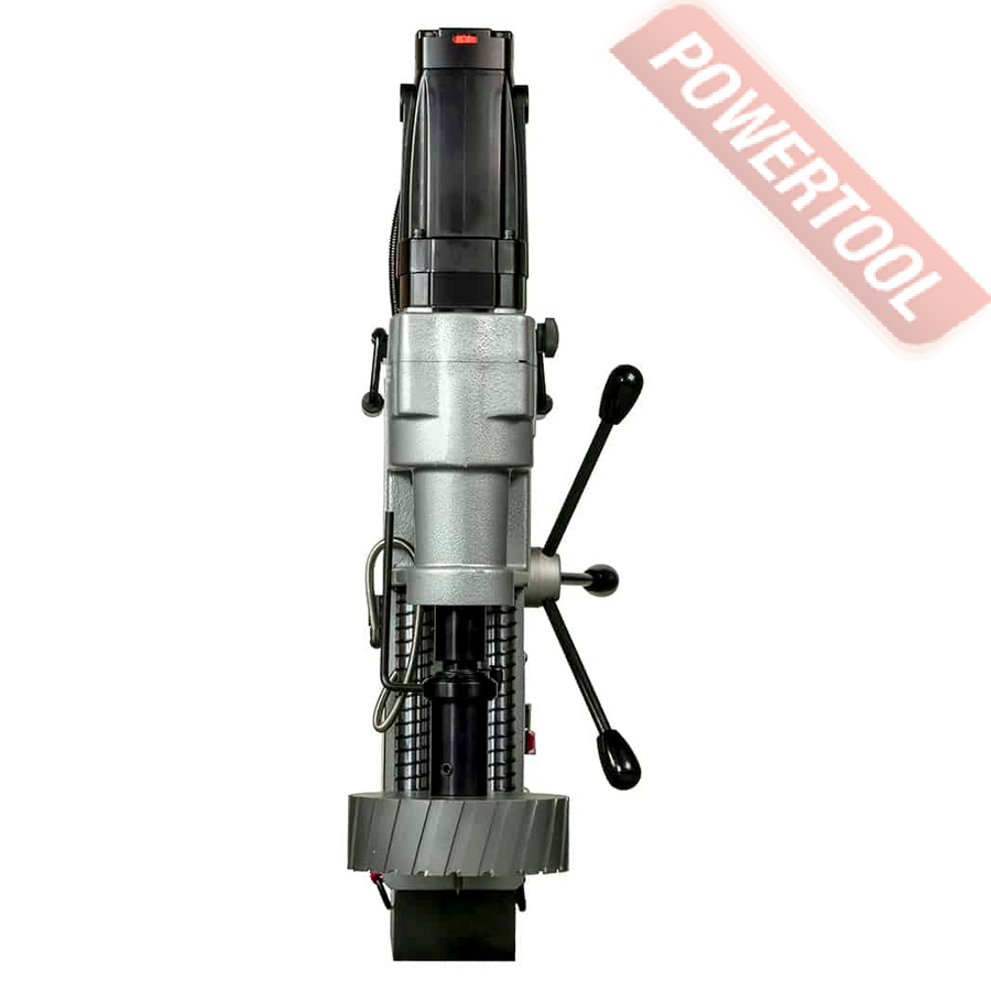 Магнитный сверлильный станок, 3800 Вт, 220 В, max диаметр корончатого сверла 200 мм, max диаметр спирального сверла 44 мм, конус шпинделя КМ 4, крепление корончатого сверла на Weldon 32, ход шпинделя 180 мм, частота вращения шпинделя 70-150/170-410 об/мин, 2 скорости, прижимная сила 38246 Н, размер магнитного основания ДхШ 330х110 мм, габариты ДхШхВ 480х260х840 мм, вес 53 кг, плавная регулировка оборотов, встроенная система подачи СОЖ, в комплекте патрон КМ 4/Weldon 32, рукоятки 3 шт, страховочный ремень, набор шестигранных ключей 2.5, 5, 8 мм, клин, кейс.