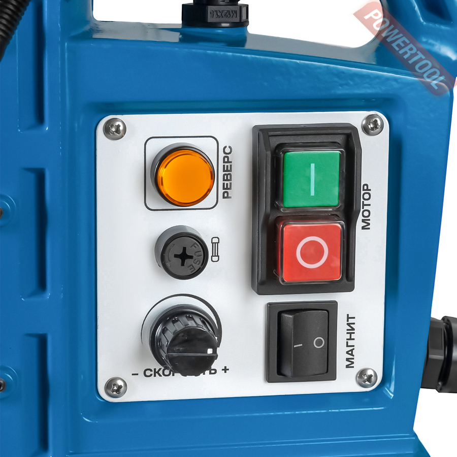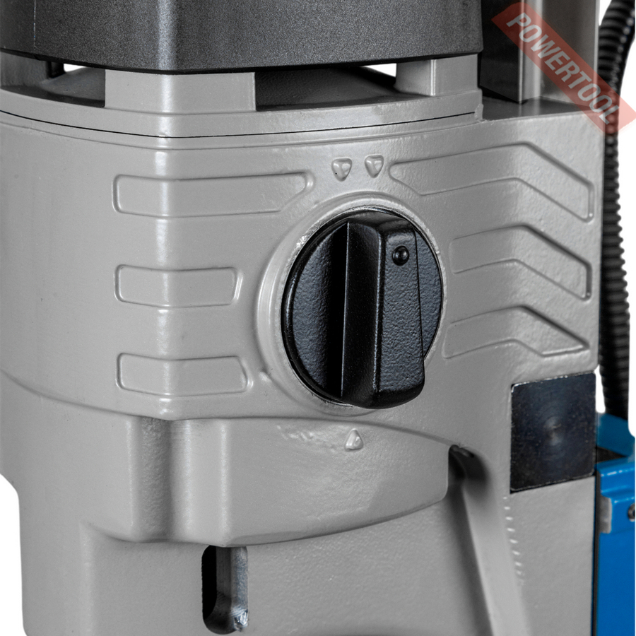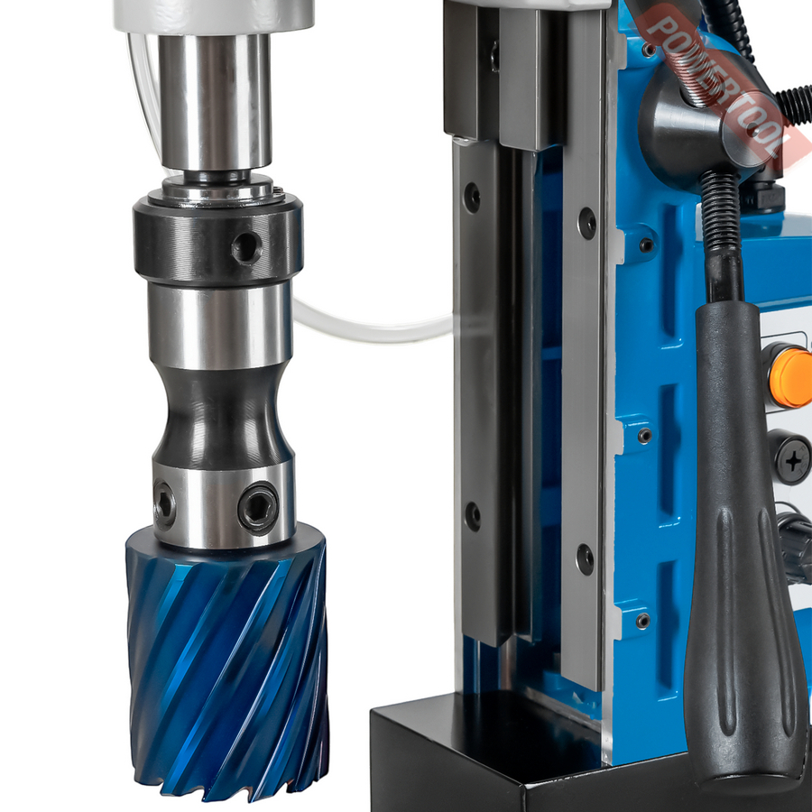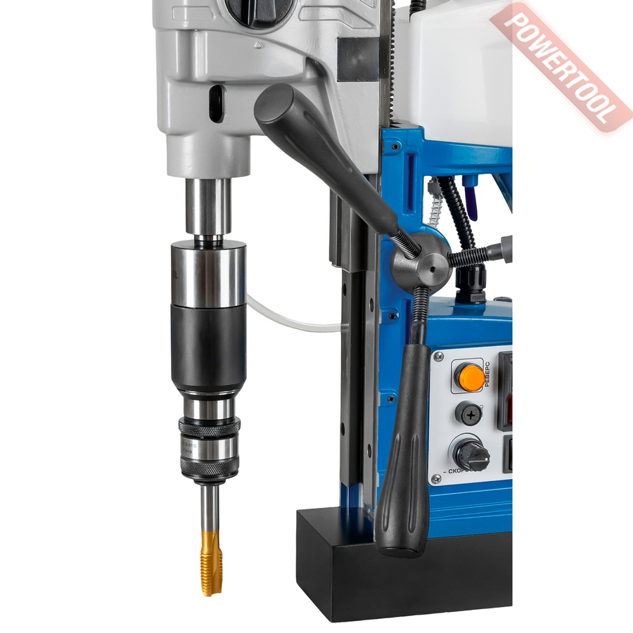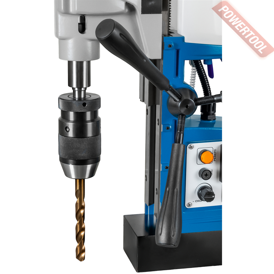Магнитный сверлильный станок, 1700 Вт, 220 В, max диаметр корончатого сверла 50 мм, max диаметр спирального сверла 22 мм, конус шпинделя КМ 2, крепление корончатого сверла на Weldon 19, ход шпинделя 230 мм, max нарезаемая резьба M20, частота вращения шпинделя 100-320/100-560 об/мин, 2 скорости, прижимная сила 14500 Н, вес 12,8 кг, реверс, плавная регулировка оборотов, система подачи СОЖ, в комплекте патрон КМ 2/Weldon 19, стопор, система СОЖ, рукоятка подачи 3 шт, страховочный ремень, предохранитель 2 шт, 2 шестигранника на 1.5, 6 мм, клин, кейс.