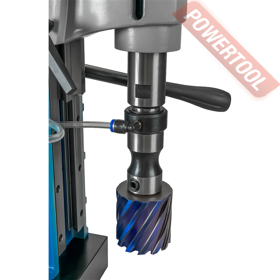 Магнитный сверлильный станок, 1890 Вт, 220 В, max диаметр корончатого сверла 65 мм, max диаметр спирального сверла 25 мм, конус шпинделя КМ 3, крепление корончатого сверла на Weldon 19, ход шпинделя 220 мм, max нарезаемая резьба M22, частота вращения шпинделя 100-210/100-520 об/мин, 2 скорости, прижимная сила 15800 Н, вес 18 кг, реверс, плавная регулировка оборотов, система подачи СОЖ, в комплекте патрон КМ 3/Weldon 19, стопор, система СОЖ, рукоятка подачи 3 шт, страховочный ремень, предохранитель 2 шт, шестигранник на 1.5 мм, клин, фиксатор привода 2 шт, кейс.