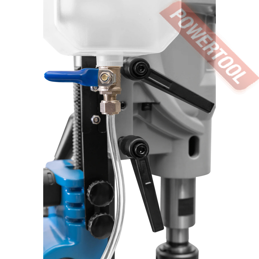 Магнитный сверлильный станок, 2690 Вт, 220 В, max диаметр корончатого сверла 80 мм, max диаметр спирального сверла 23 мм, конус шпинделя КМ 3, крепление корончатого сверла на Weldon 19, ход шпинделя 230 мм, частота вращения шпинделя 165/350/750 об/мин, 3 скорости, прижимная сила 17600 Н, габариты ДхШхВ 350х150х290 мм, вес 17,5 кг, автоподача, регулировка оборотов, система подачи СОЖ, в комплекте патрон КМ 3/Weldon 19, система СОЖ, рукоятка регулировки высоты 3 шт, страховочный ремень, предохранитель 2 шт, набор шестигранников 2, 3, 6 мм, клин, кейс.