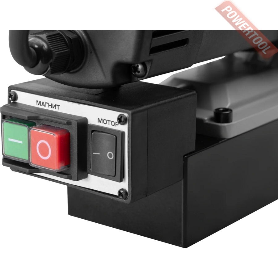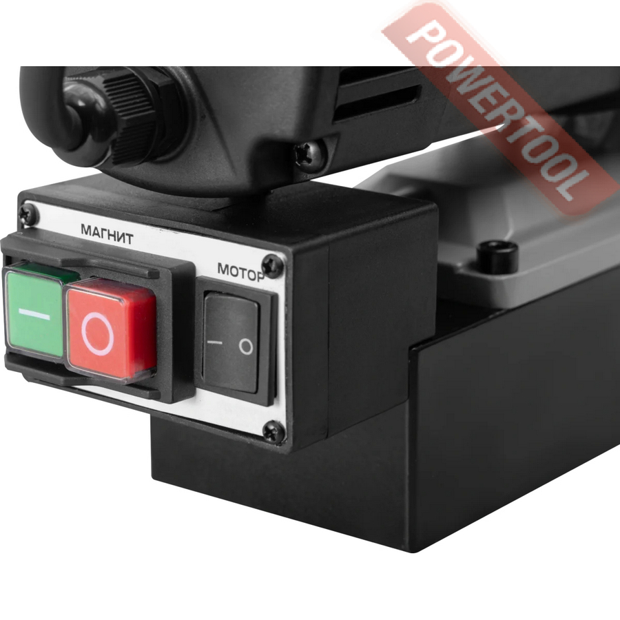 Магнитный сверлильный станок, 1650 Вт, 220 В, max диаметр корончатого сверла 40 мм, крепление корончатого сверла на Weldon 19, ход шпинделя 45 мм, частота вращения шпинделя 850 об/мин, 1 скорость, прижимная сила 14500 Н, габариты 350х150х190 мм, вес 8,5 кг, система подачи СОЖ, в комплекте емкость с распылителем для СОЖ, рукоятка, ключ-трещотка, страховочный ремень, предохранитель 2 шт, шестигранник 5 мм, кейс.