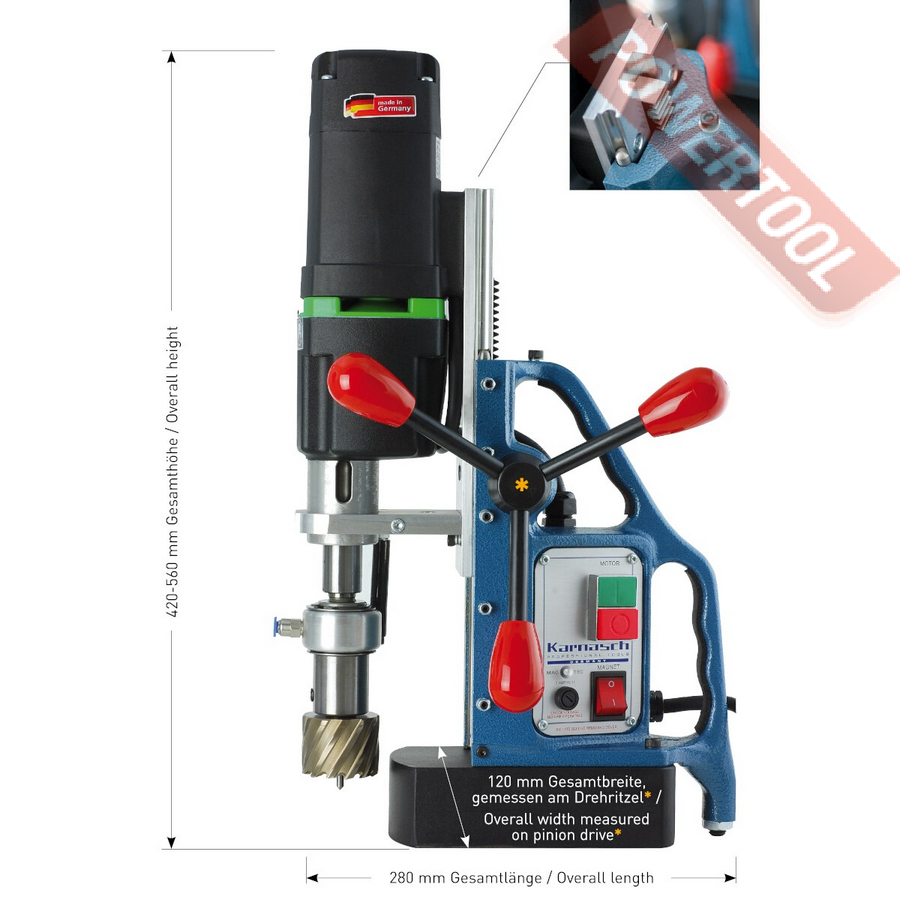 Магнитный сверлильный станок KARNASCH KA 50 Blue-Mag оснащенный системой «двойных рельсовых направляющих», которая рассчитана на большую нагрузку с глубиной сверления до 110 мм. Магнитное основание надежно фиксируется. Максимальная глубина резания составляет 55 мм. При использовании штифтов выталкивателя, состоящих из двух частей, возможна глубина резания до 110 мм от диаметра 18 мм.