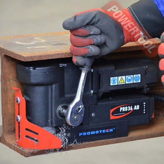 Магнитный сверлильный станок PROMOTECH PRO-36 AD который помещается даже в самых узких местах, успешно прошел испытания, и теперь Promotech готова запустить его на рынок. ПРО-36 АД является отличным решением в любых ограниченных пространствах, где из-за своих габаритов не помещаются обычные магнитные станки. Станок выполняет отверстия корончатыми сверлами диаметром до 36 мм и спиральными до 12 мм. Глубина сверления корончатыми сверлами из быстрорежущей стали составляет 20 мм, но может быть увеличена до 25 мм за счет длинной втулки. Для корончатых сверл с твердосплавными напайками максимальная глубина 30 мм.