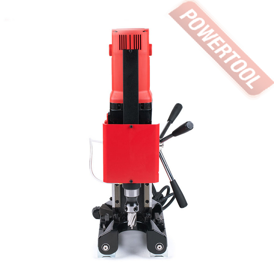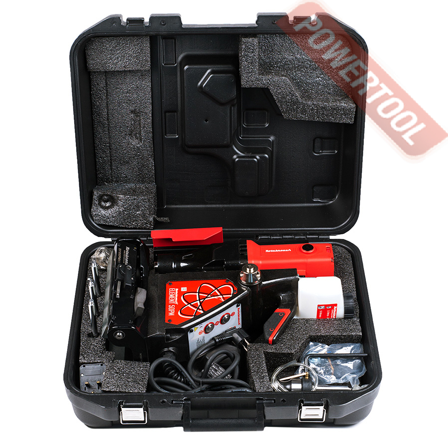 Магнитный сверлильный станок, 1500 Вт, 220 В, max диаметр корончатого сверла 50 мм, max диаметр спирального сверла 23 мм, конус шпинделя КМ 2, крепление корончатого сверла на Weldon 19, ход шпинделя 140 мм, max нарезаемая резьба M20, частота вращения шпинделя 100-265/200-500 об/мин, 2 скорости, прижимная сила 8430 Н, размер магнитного основания ДхШ 277х190 мм, габариты ДхШхВ 317х190х640 мм, вес 17,7 кг, реверс, плавная регулировка оборотов, система подачи СОЖ, возможность фиксации на трубах, в комплекте патрон КМ 2/Weldon 19, патрон КМ 2/B16, трехкулачковый патрон 1-13 мм, система охлаждения, страховочный ремень, рукоятка подачи 3 шт, набор ключей, комплект угольных щеток, клин, кейс.