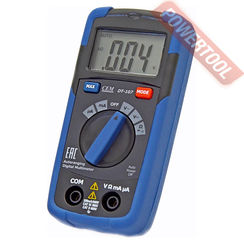Наиболее востребован CEM DT-107 при выполнении измерений, требующих высокой скорости работы. При использовании данного мультиметра нет необходимости выбирать пределы измерений вручную — это прибор делает автоматически. Данная функция отличает CEM DT-107 от младших моделей серии. Таким образом вы сократите время подготовки к производству замеров и исключите возможность повреждения измерительного контура из-за случайной ошибки при выборе диапазона. Дополнительную защиту от перегрузок обеспечивает внутренний сменный малоинерционный предохранитель.