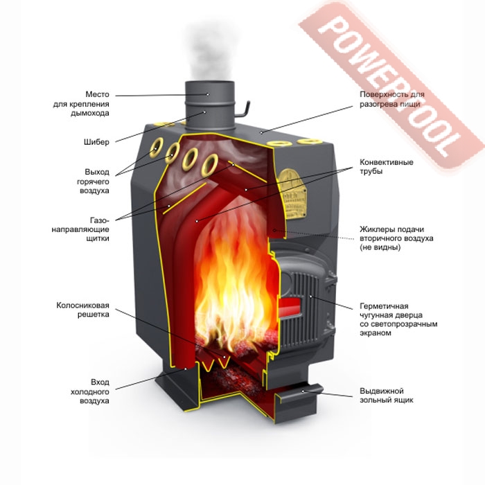 • Котел состоит из конвективных труб, окружающих топочною камеру. Их поверхность эффективно используется для передачи тепла, циркулирующему по ним воздуху отапливаемого помещения. Специально организованный лабиринт из конвективных труб и газонаправляющих экранов в верхней зоне топочной камеры позволяет более полно использовать тело уходящих в дымоход газов. Эта система состоит из герметично закрепленных, между верхней крышкой и днищем корпуса, труб с открытыми торцами. По боковым сторонам камеры идут изогнутые трубы, перекрещивающиеся вверху, а в задней и передней частях топочной камеры &ndash прямые. Трубы полностью находятся под волздействием пламени, также в процесс теплообмена включены передняя и задняя стенка печи. Входные отверстия конвективных труб находятся на возвышении от уровня пола, что благоприятно для свободной конвекции воздуха нагреваемого воздуха. Специльные жиклеры подают горячий воздух для дожигания уходящих гаов.