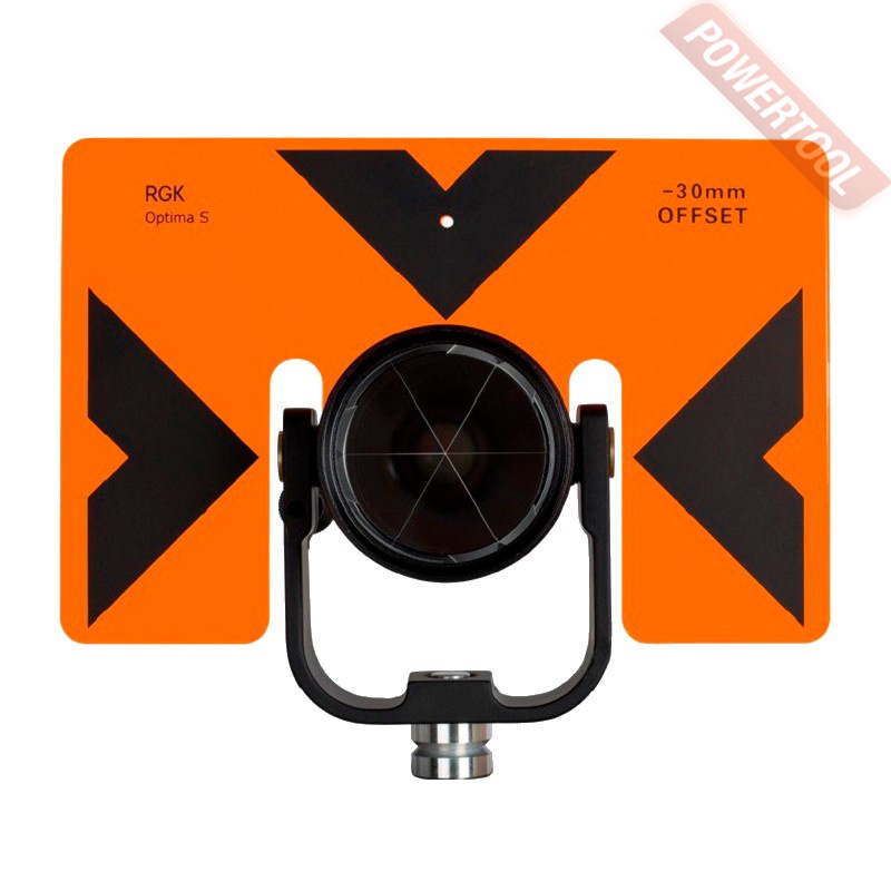 Отражатель с круглой призмой в пластиковом корпусе, металлическая увеличенная двухцветная марка, max дистанция измерений с помощью тахеометра 2500 м, поправочный коэффициент -30/0 мм, диаметр призмы 64 мм, резьба фитинга для соединения 5/8 дюйма, вес призмы 0,35 кг, вес в сборе 0,73 кг, чехол.