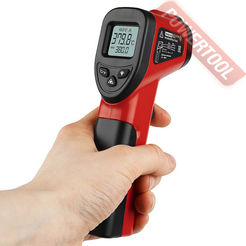 Для комфортного считывания показаний при выполнении работ в слабоосвещенных местах ЖК-дисплей пирометра снабжен подсветкой, которая включается и выключается отдельной кнопкой. В качестве источника питания в приборе используются 2 щелочные батарейки популярного типоразмера AAA. В рабочем положении они размещаются в пистолетной рукоятке под откидной крышкой и могут быть быстро заменены без использования инструментов. В случае 15-секундного бездействия в измерителе активируется функция автоотключения, которая способствует продлению ресурса батарей.