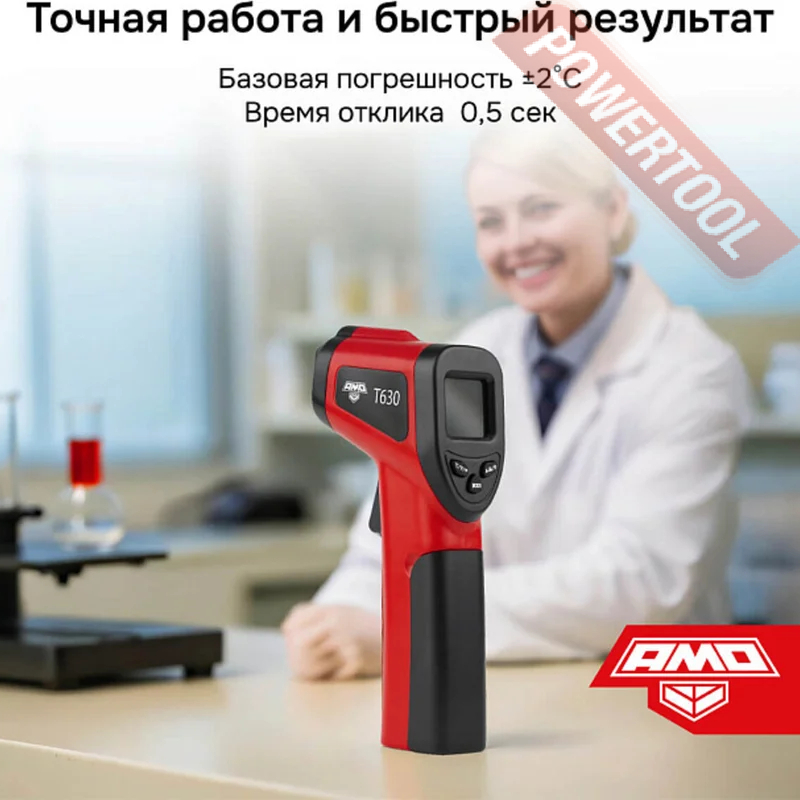 Пирометр AMO T630 – высокопроизводительный прибор карманного форм-фактора с питанием от 2 батарей типоразмера AAA, который позволяет измерять поверхностную температуру целевых объектов в дистанционном режиме. Регулируемый показатель коэффициента излучения EMS, от 0.1 до 1.0, обеспечивает более высокую точность показаний, по сравнению с младшими модификациями устройств серии T600, при определении температурных показателей изделий, изготовленных из разнотипных материалов. Расширенный измерительный диапазон инструмента, от –50 до +550 градусов С, при разрешении в 0,1 градуса С и погрешности, не превышающей 2 процента, позволяет использовать его для решения широкого круга технических, диагностических и прикладных задач, в том числе в промышленных отраслях и энергетике.
