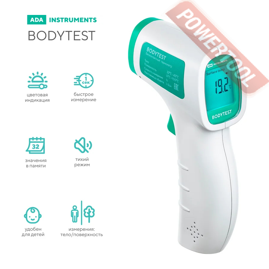 Пирометр медицинский ADA BodyTest с функцией измерения температуры тела предназначен для дистанционного бесконтактного измерения температуры по тепловому (инфракрасному) излучению обследуемого объекта. Предусмотрен индикатор низкого заряда батареи, который указывает на необходимость замены батарей. Все полученные результаты отображаются на ЖК-дисплее.