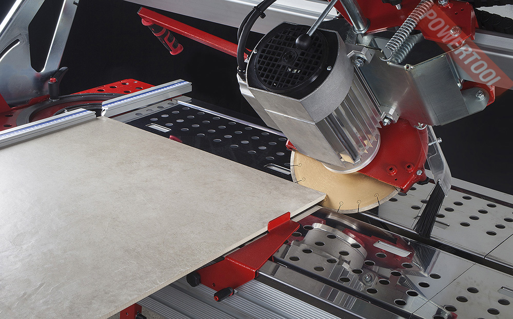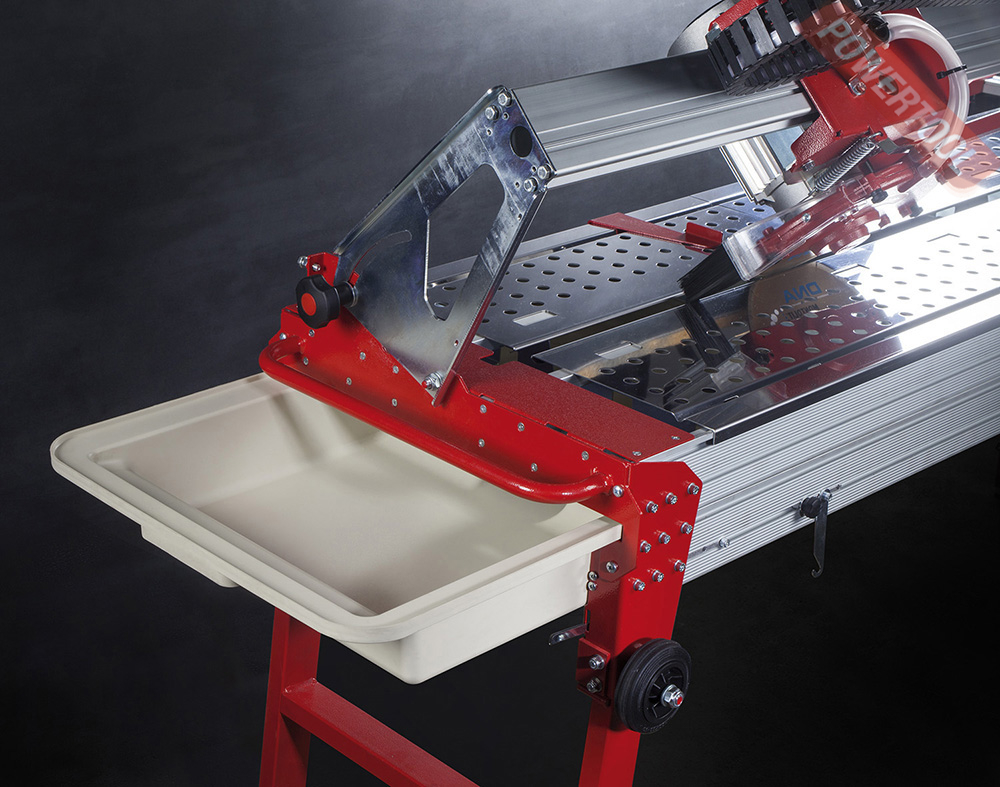 - Оснащение: защитный кожух с системой улавливания брызг и водяной пыли, поворачивающаяся линейка-гониометр, две пары колёс, выдвижной поддон для воды, система фиксации плитки, металлический короб с гофрой.