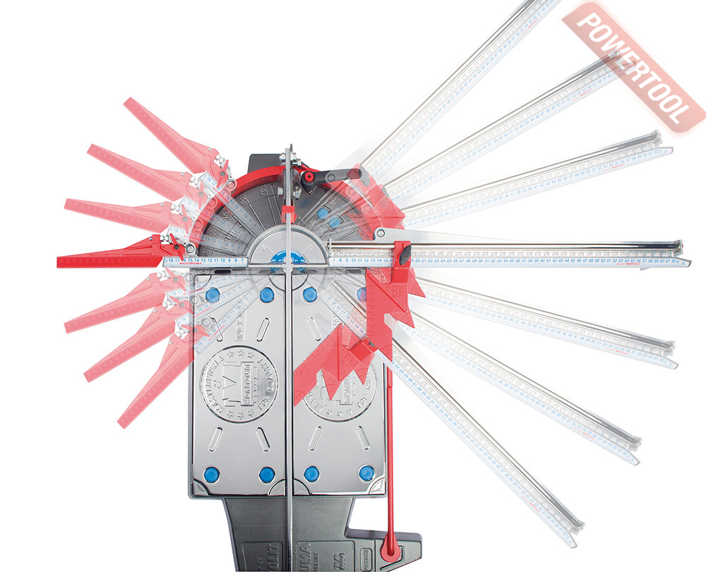 • Станок оснащён профессиональной линейкой с двумя шкалами. Вращение линейки от -45 до +45 градусов и мгновенная фиксация под заданным углом с помощью специального рычага.