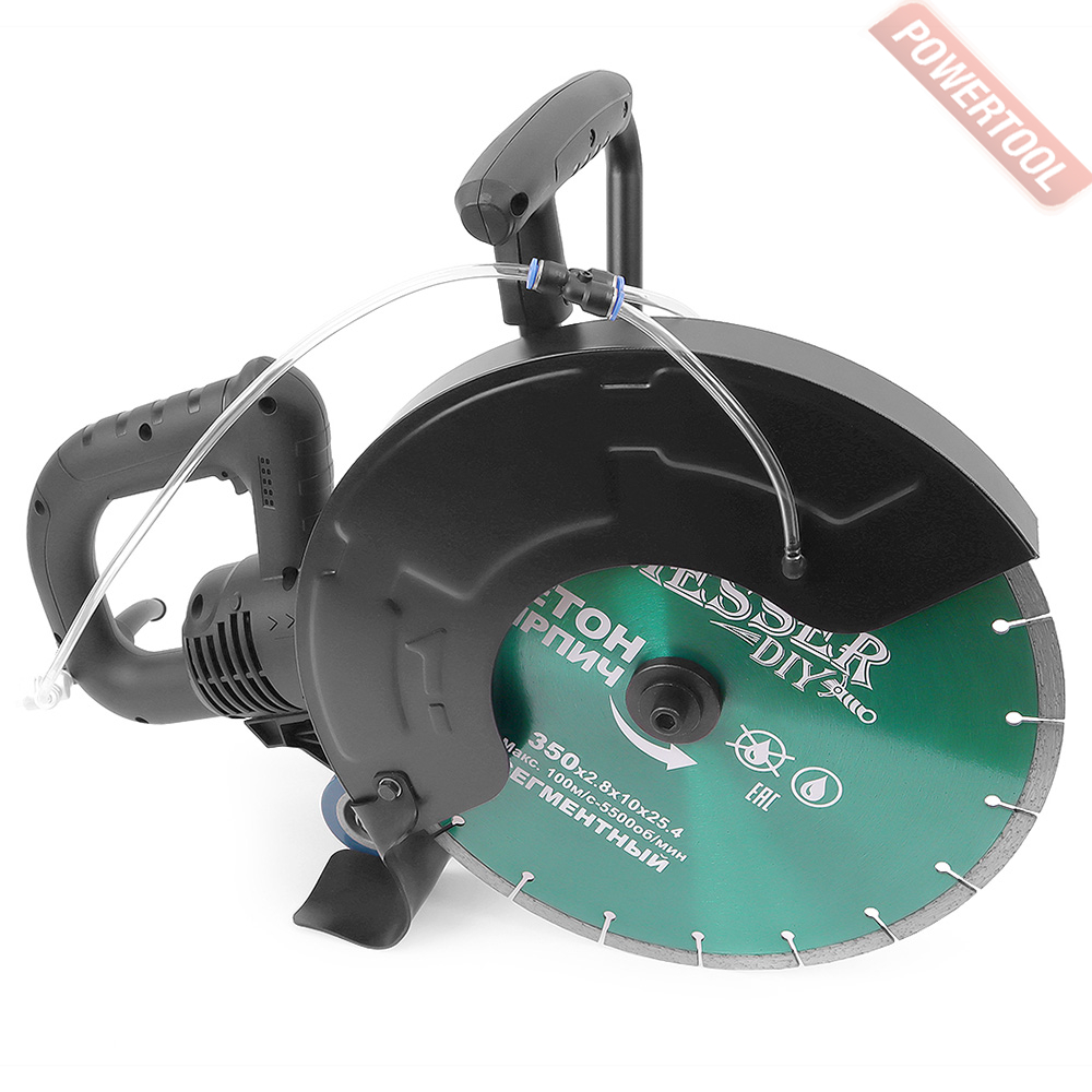 Электрический резчик, диск диаметром 350х25,4 мм, глубина реза 155 мм, число оборотов диска 2650 об/мин, электрический двигатель мощностью 3500 Вт, 220 В, плавный пуск, электронная защита от перегрузок, защита от пониженного напряжения, система подачи воды в зону реза, вес 7,1 кг, диск в комплект поставки не входит и приобретается отдельно.