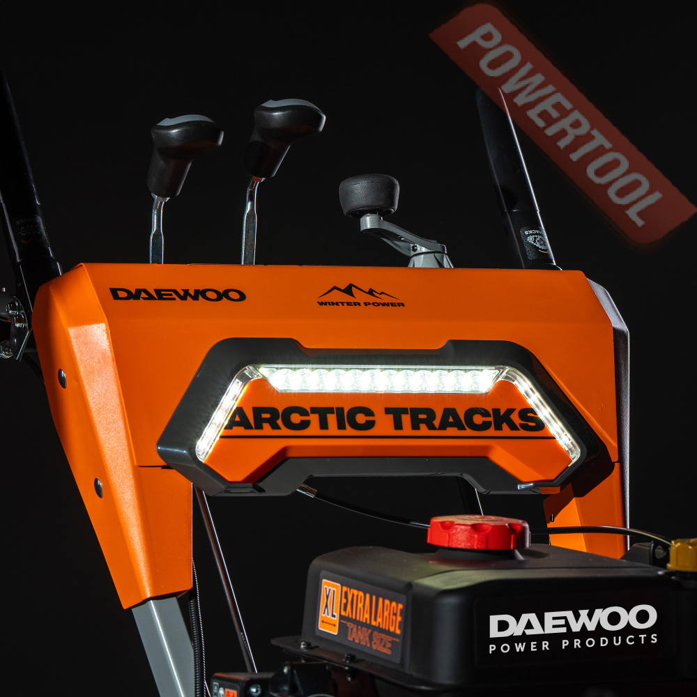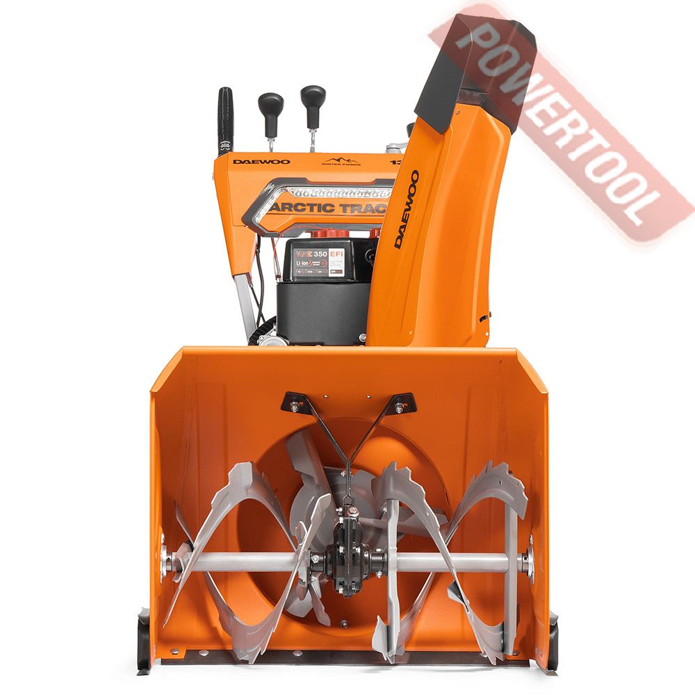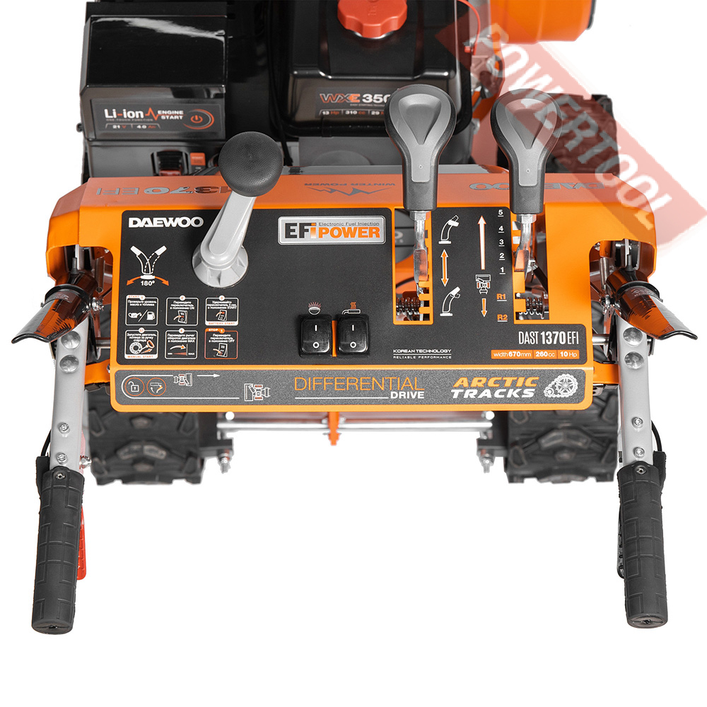 Снегоуборщик гусеничный самоходный, ширина ковша 67 см, высота ковша 55 см, скорости 5 вперед и 2 назад, выбор направления и дальности выброса снега рукоятками с панели оператора, угол поворота желоба 180 градусов, дальность выброса достигает до 16 м, материал желоба сталь, управление одной рукой, разблокировка дифференциала курком под одной из рукояток, подогрев рукояток, двухсоставные направляющие лыжи, LED фара, защита от ржавчины ZN+, гусеницы Arctic Track, 4-тактный бензиновый инжекторный двигатель DAEWOO WXE 350 EFI (Electronic Fuel Injection) объемом 310 куб.см и мощностью 13 л.с., электростартер от аккумулятора 21 В, топливный бак 5,2 л, объем картера 1,1 л, размеры упаковки 1050х750х800 мм, вес 117 кг, АКБ и ЗУ.