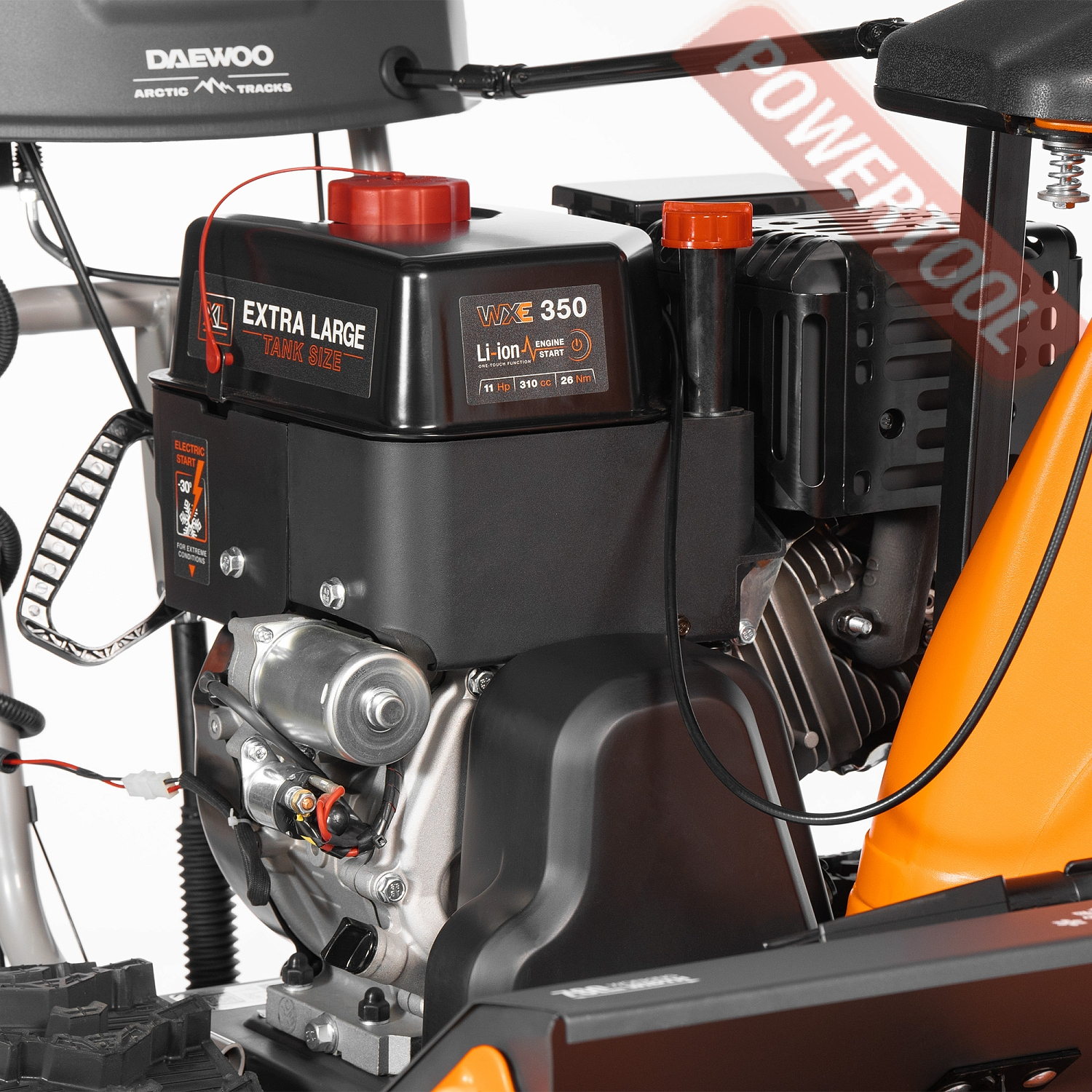 - Двигатель DAEWOO зимней серии WXE 350. Уверенный запуск при отрицательных температурах. Электрозапуск от съемной батареи 21В. Повышенный моторный ресурс. Увеличенный глушитель и сниженный уровень шума.