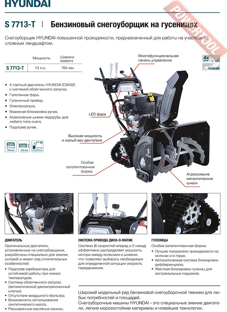 Снегоуборщик гусеничный самоходный, ширина ковша 76,4 см, высота ковша 54 см, скорости 6 вперед и 2 назад, выбор направления и дальности выброса снега рукоятками с панели оператора, дальность выброса достигает до 15 м, автоматический дифференциал, подогрев рукояток, LED фара, гусеницы Х-ТRACK, 4-тактный бензиновый двигатель HYUNDAUI ICW400 объемом 389 куб.см и мощностью 13 л.с., электростартер от сети 220 В, топливный бак 6 л, объем картера 1,1 л, трансмиссия фрикционный диск, вес 135 кг.