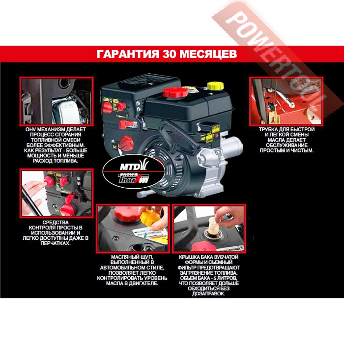 - Четырехтактный бензиновый двигатель MTD SnowThorX 80 специальной зимней серии с рабочим объемом 277 куб. см, и мощностью 7.3 л.с. предназначенный для работы при отрицательных температурах. Благодаря применению современных технологий, двигатель имеет высокий крутящий момент во всем диапазоне рабочих оборотов, характеризуется экологичностью и малым расходом топлива, отличается низким уровнем вибраций и шума.